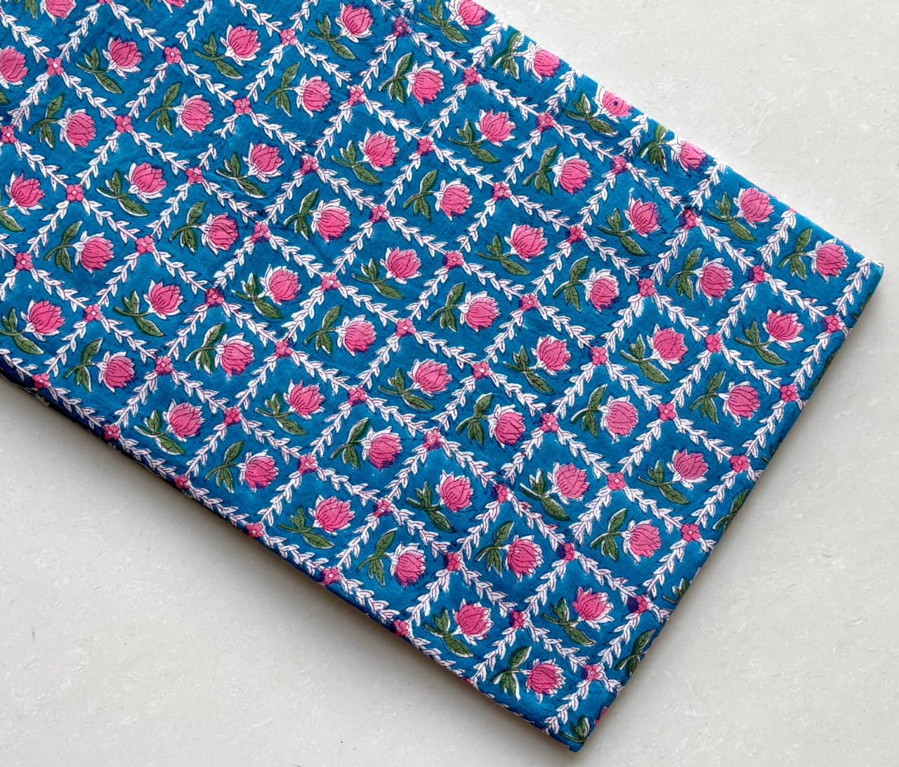 With a captivating cyan backdrop, this fabric showcases a charming grid adorned with vibrant hot pink roses, surrounded by lush green leaves. Each square tells a story of meticulous craftsmanship, where traditional techniques meet a fresh, modern sensibility. The symmetry of the floral designs offers a sense of balance and harmony, perfect for both fashion creations and home décor.”