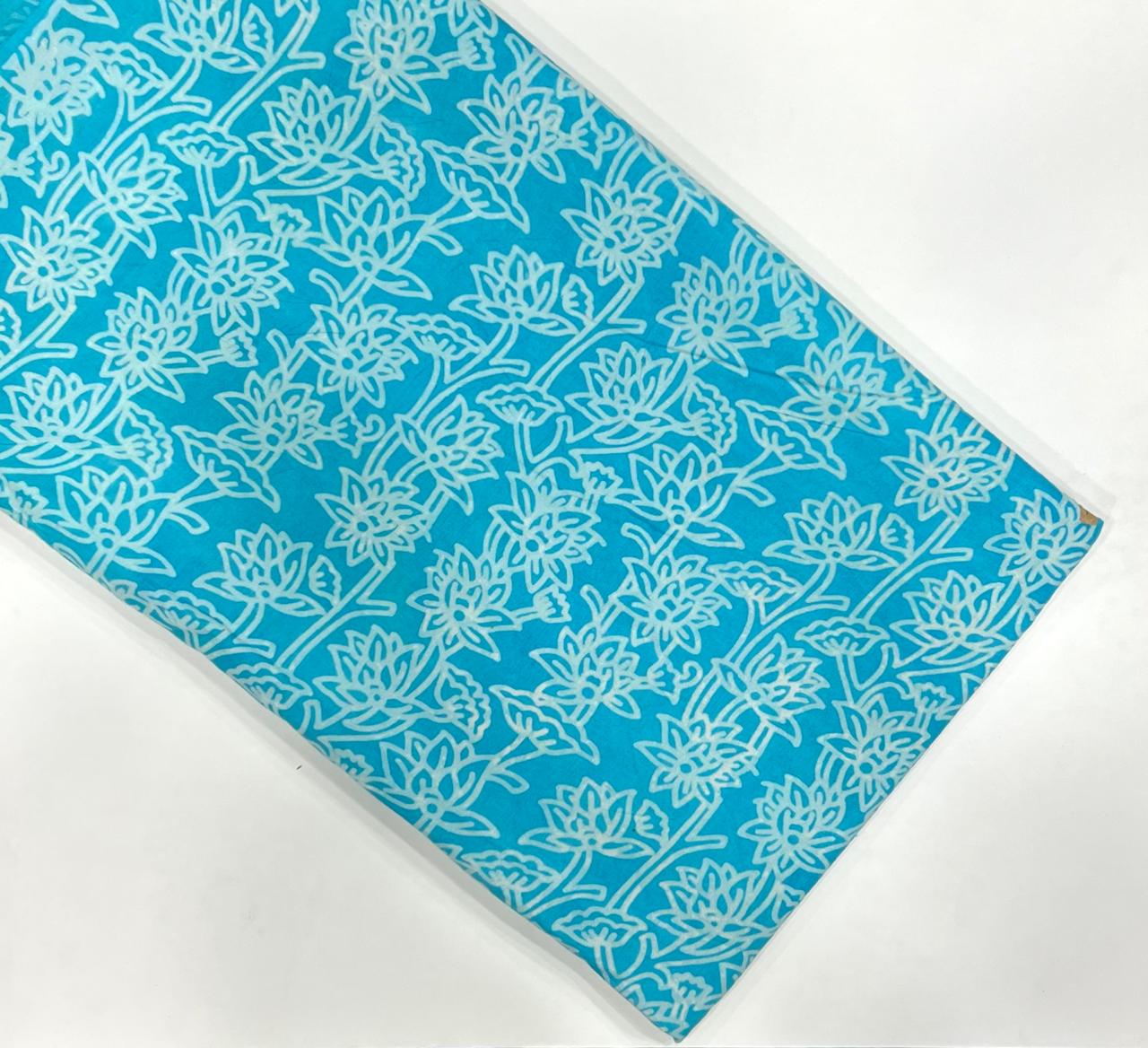 Immerse your creativity in the enchanting world of our Cyan Lotus Dance Dabu Cotton Running Fabric. This exquisite textile showcases a vibrant cyan backdrop adorned with delicate lotus motifs, offering a refreshing take on classic Indian artistry. Each floral element, meticulously crafted, flows gracefully across the fabric, inviting you to explore endless possibilities in your fashion creations.
