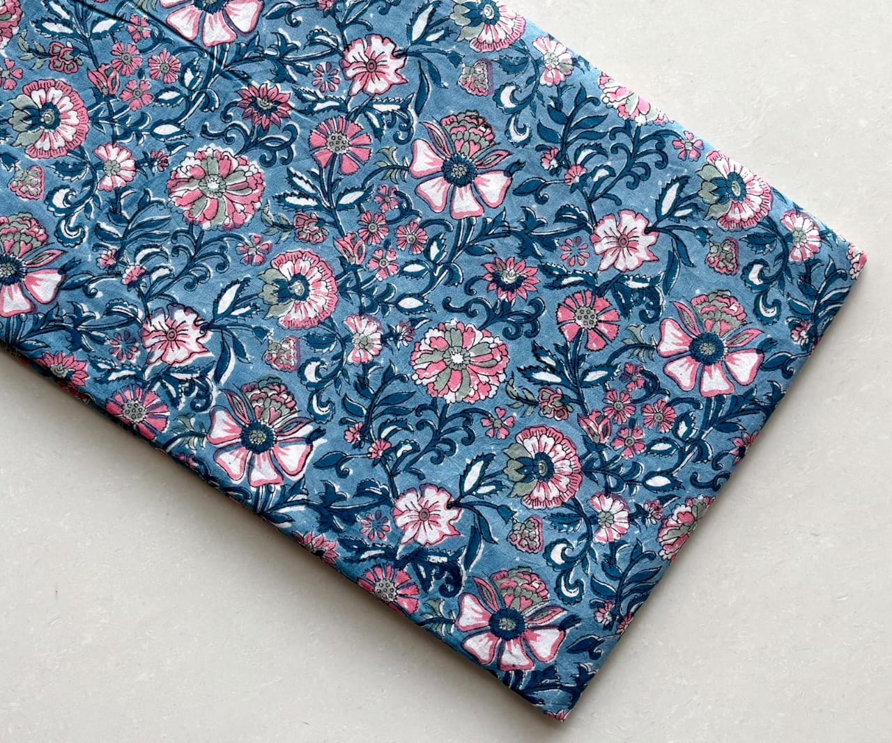 Embrace the elegance of traditional artistry with our Deep Blue Floral Artisan Cotton Running Fabric. This exquisite textile reflects the charm of hand block printing, where skilled artisans have brought to life a tapestry of vibrant floral motifs against a serene blue background. The delicate interplay of pale pink and crimson blossoms, accented with soft sage green leaves, transforms this fabric into a canvas of nature’s beauty.