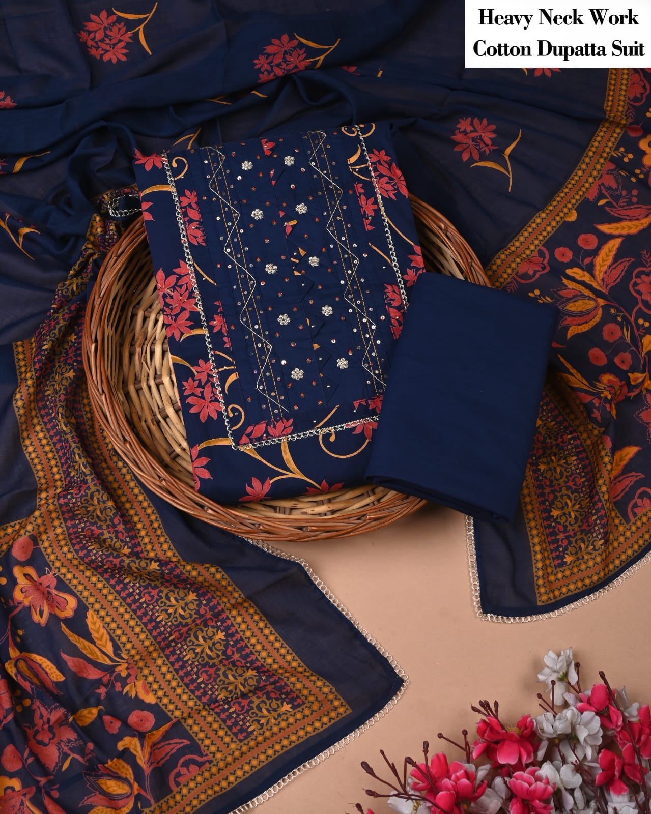 Crafted from the vibrant tradition of Indian textiles, this enchanting ensemble in deep navy is adorned with delicate floral motifs, bringing a touch of nature's beauty to your wardrobe. The rich fabric, combined with intricate Gota Patti embellishments, creates a visual feast that speaks of artistry and craftsmanship.