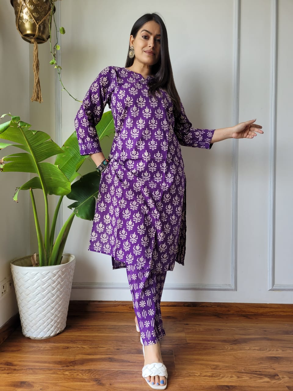 Delve into the richness of Indian textile artistry with our Deep Purple Floral Elegance Cotton A-Line Kurti Set. This artisan-crafted piece showcases a mesmerizing floral print against a deep purple backdrop, evoking both tradition and modernity.