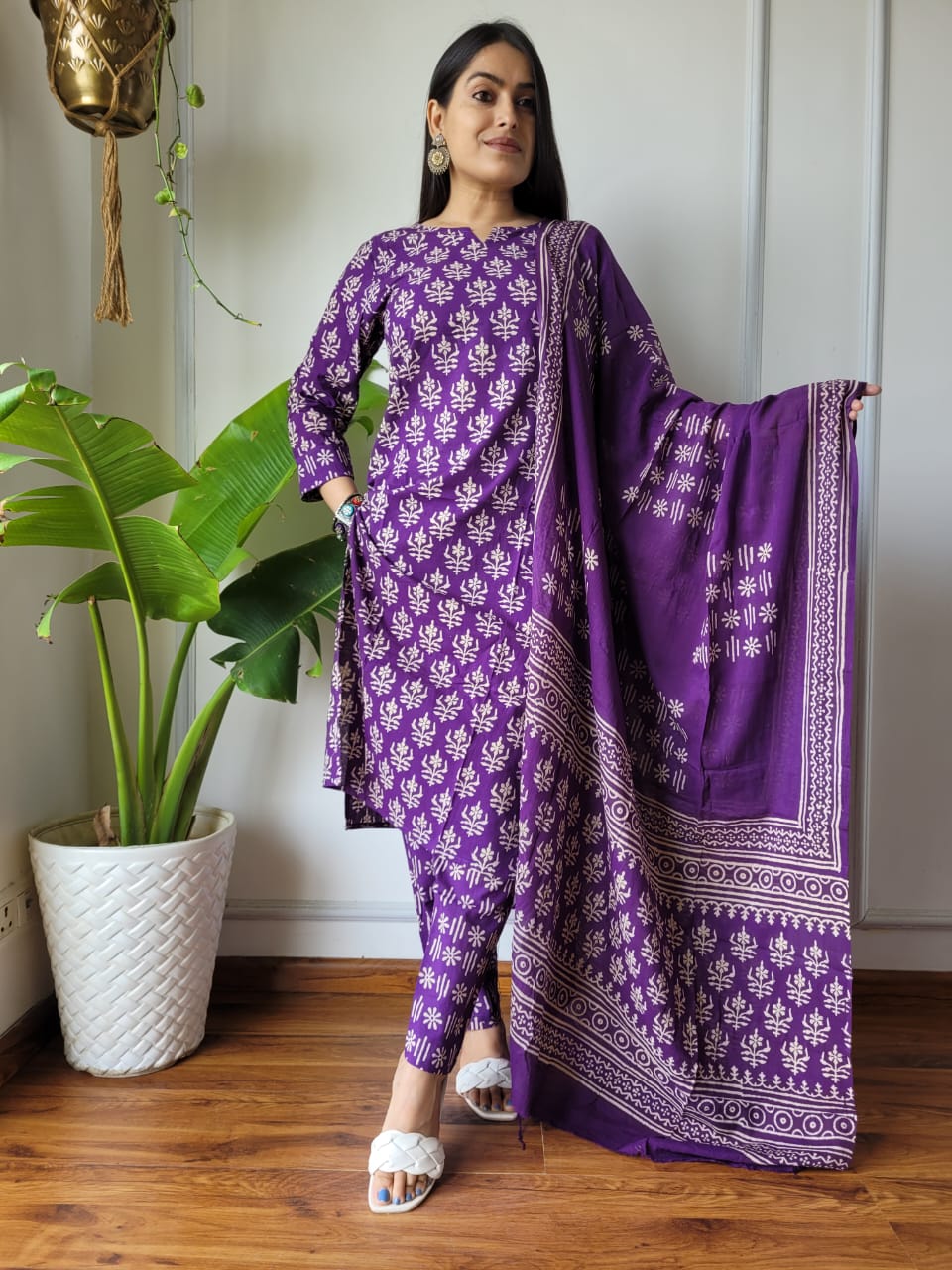 Finding an outfit that balances comfort with elegance can be a delightful challenge. This deep purple cotton suit set offers a sophisticated solution, featuring delicate cream floral motifs that dance across the fabric, creating a visual symphony.