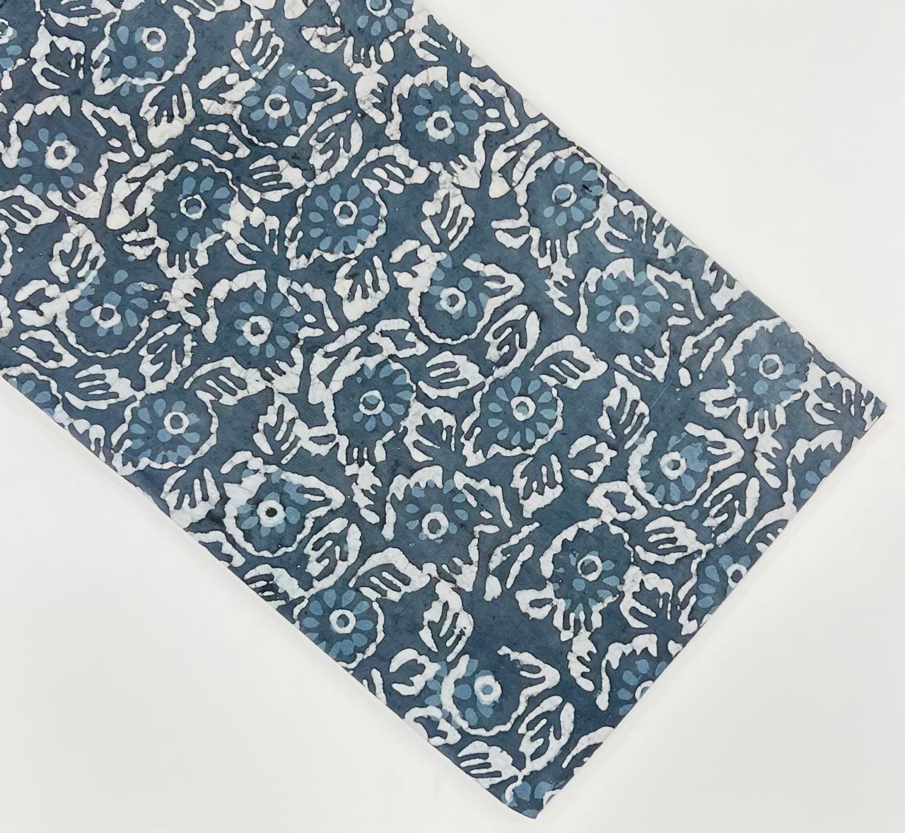Embrace the artistry of traditional Indian craftsmanship with our Deep Teal Blossom Dabu Cotton Running Fabric. This exquisite textile showcases a captivating interplay of deep navy and teal, adorned with intricate floral motifs that dance across the fabric. Each flower and leaf is a testament to the skillful hands that crafted it, offering a unique touch to your creations.