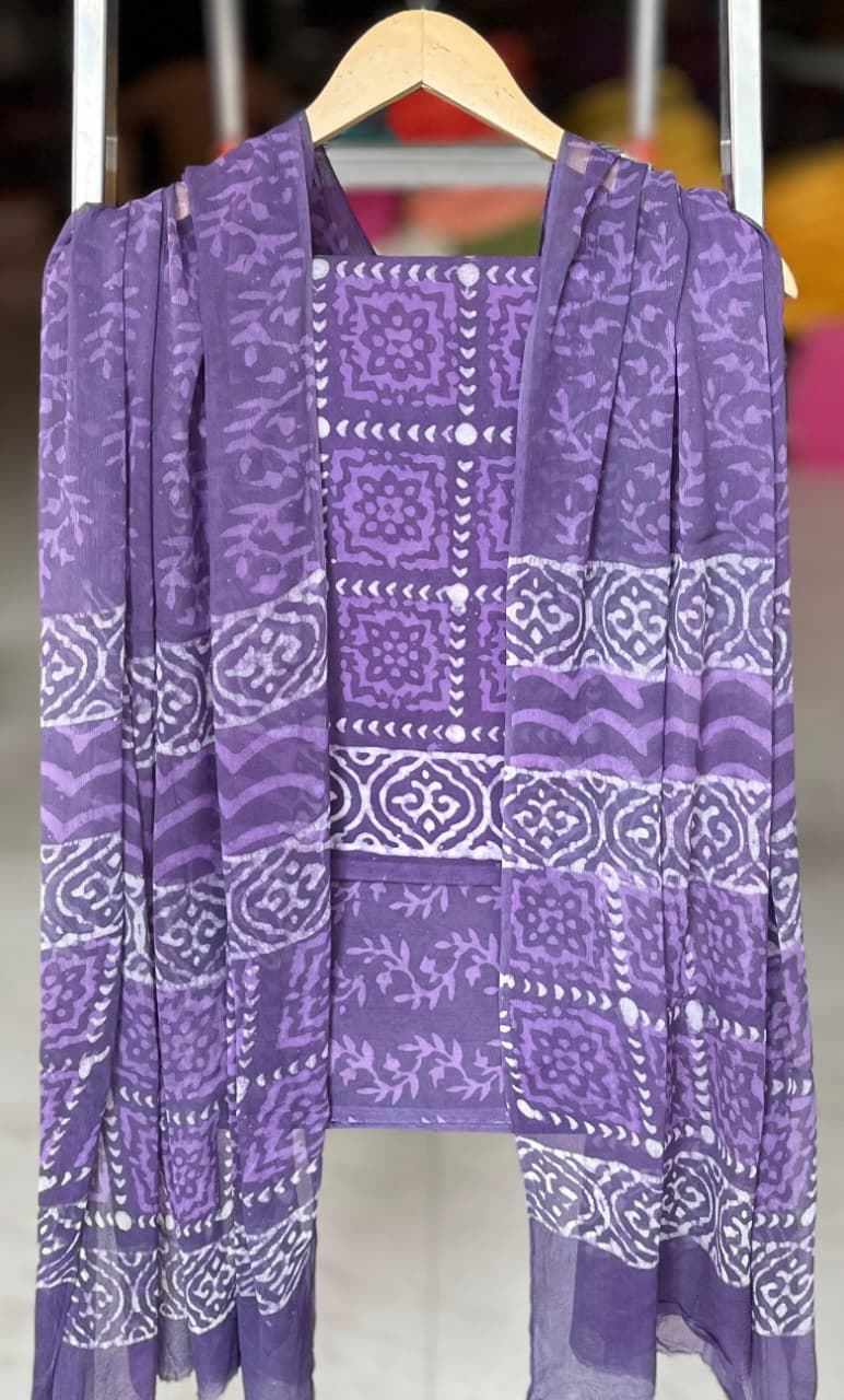 Adorned in a rich shade of deep violet, this exquisite cotton suit set embodies the artistry of traditional block printing. The soft fabric not only embraces you in comfort but also tells a story through its intricate geometric and floral motifs, meticulously hand-stamped by skilled artisans.