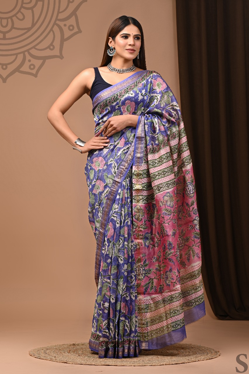 A unique dual-tone Maheshwari silk saree that blends traditional and modern aesthetics. The saree features a deep blue body with intricate hand-block printed floral designs, which transitions into a vibrant pink pallu with complementary floral and striped patterns. This saree offers a striking look and is paired with a matching blouse piece.