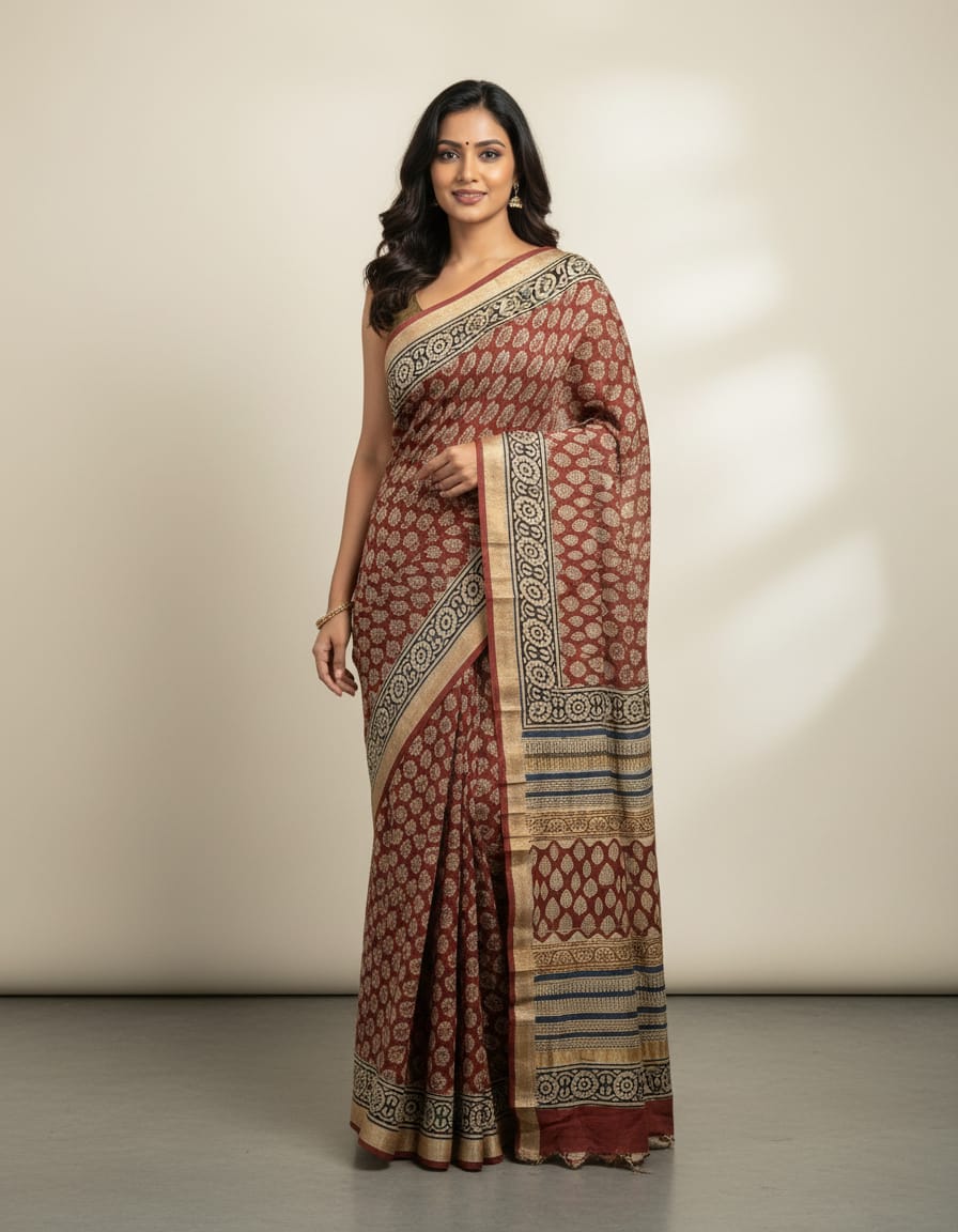 In the soft embrace of dusky rose, this Maheshwari silk saree showcases the exquisite Bagru hand block print technique, renowned for its intricate designs and cultural significance. Each piece is a canvas where traditional patterns dance gracefully, echoing the spirit of Indian craftsmanship.