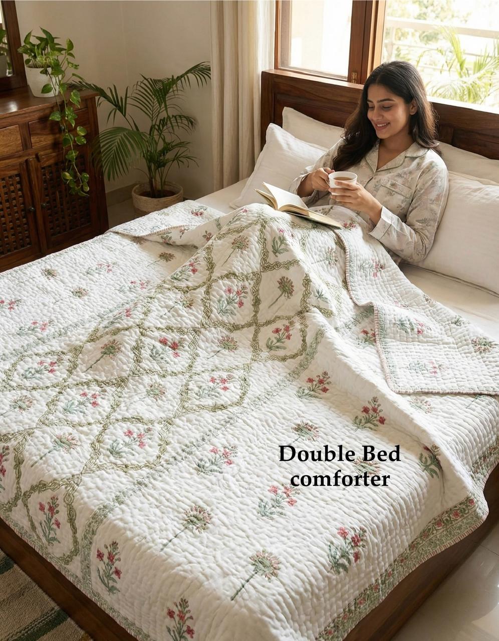 In a cozy corner of your home, a tapestry of tradition and contemporary charm awaits. The Dusky Rose Garden Quilted Cotton Comforter invites you to indulge in artistry that resonates with every thread. With a delicate floral motif, it captures the essence of hand block printing, an age-old craft that tells stories of Indian heritage.