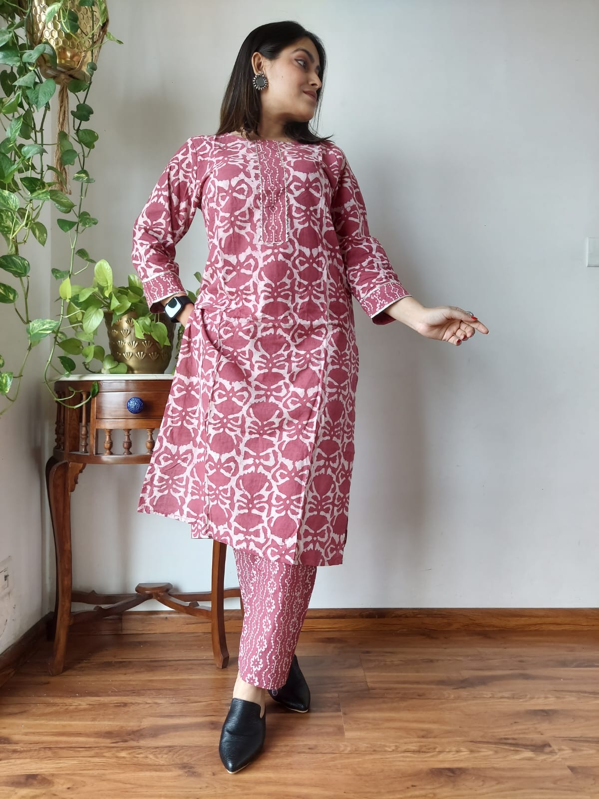 Immerse yourself in the gentle allure of our dusty rose ensemble, where delicate floral and geometric patterns intertwine to create a stunning visual tapestry. This beautifully crafted piece reflects the essence of Indian textile traditions, offering a soft, textured cotton fabric that drapes elegantly, providing both comfort and style.