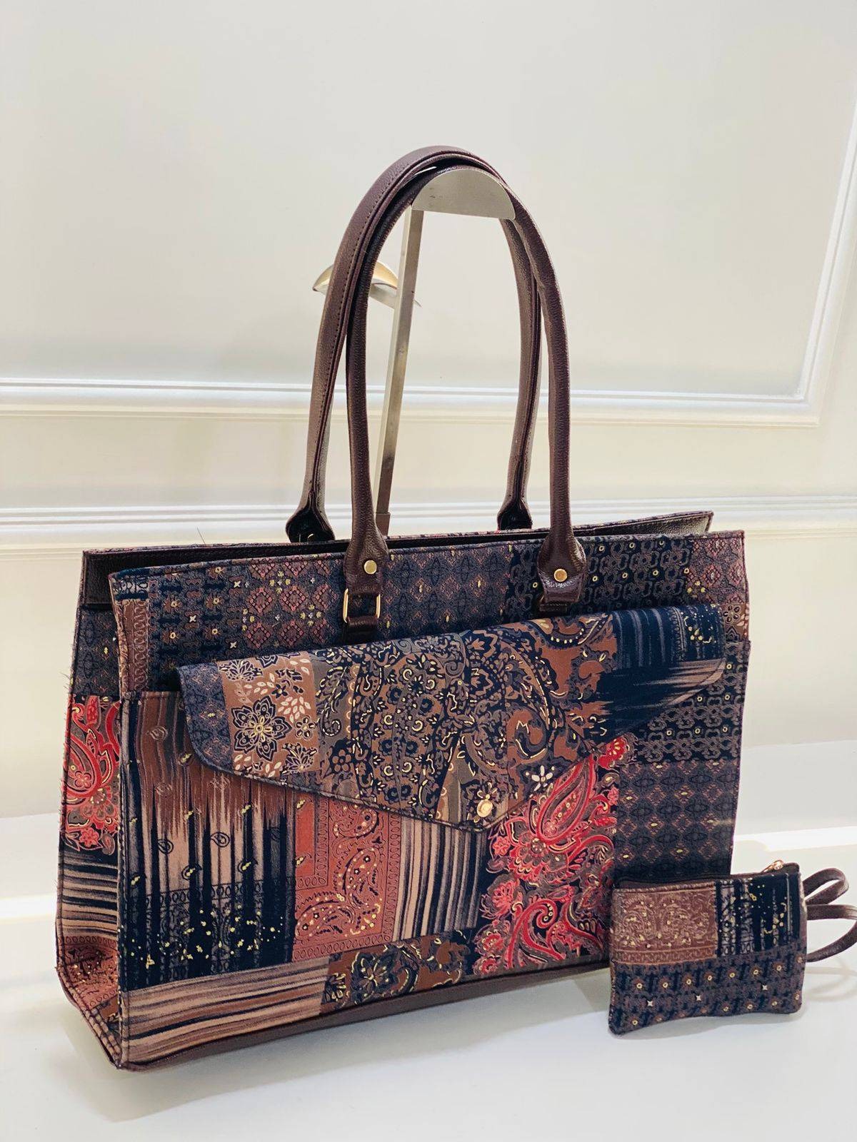 Immerse yourself in the rich heritage of Indian craftsmanship with our Earth Tone Patchwork Fabric Tote & Coin Pouch Set. Inspired by traditional hand block printing techniques, these pieces feature a mosaic of paisley, floral, and geometric motifs in warm earth tones of brown, navy blue, beige, and red. The textured fabric lends a tapestry-like feel, while the brown leather handles add a touch of elegance.
