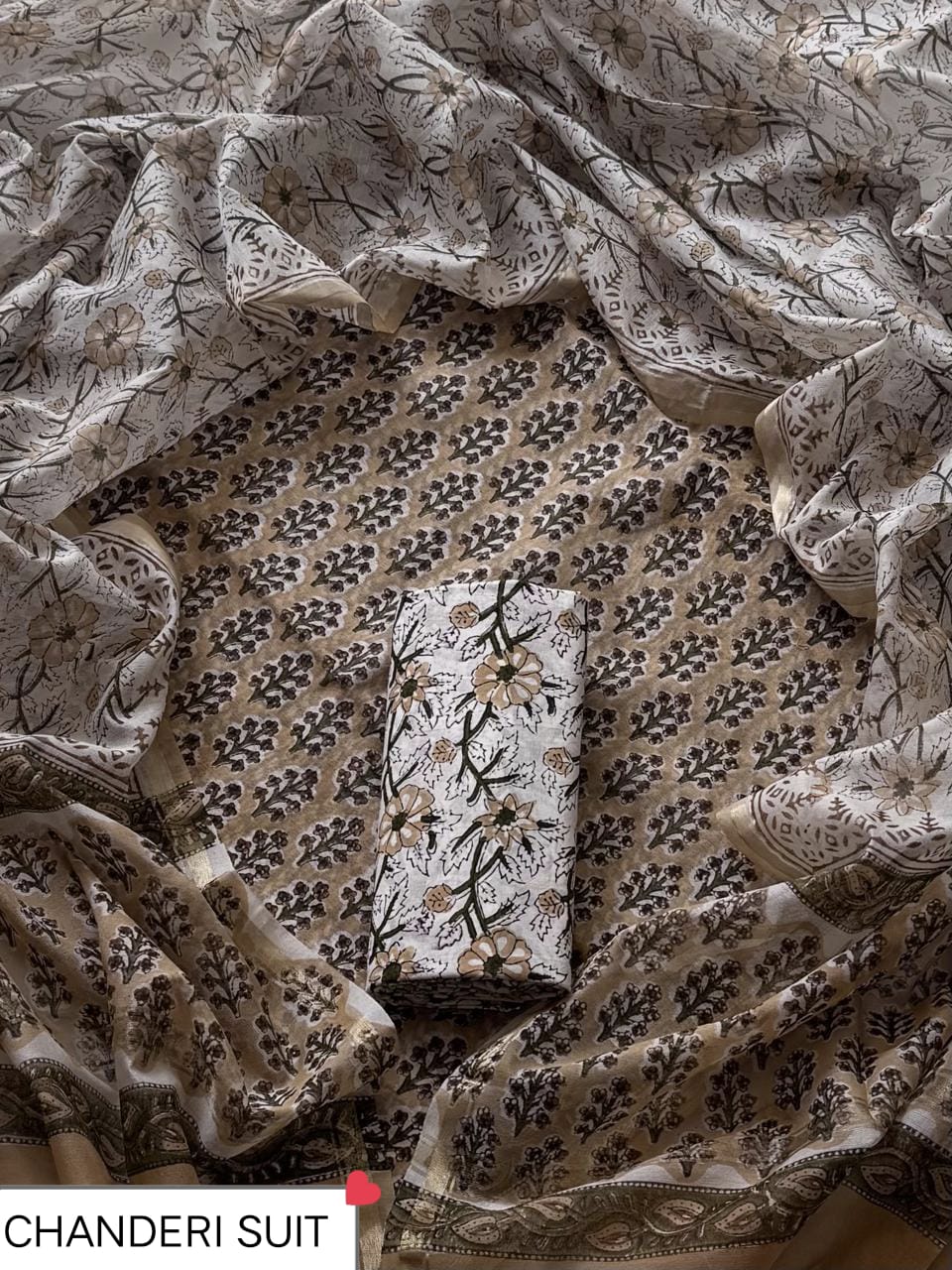 Step into a world of timeless elegance with our Earthy Brown Floral Chanderi Silk Ensemble. Crafted from fine Chanderi silk, this set features intricate floral and leafy block prints in soothing shades of beige, brown, and off-white. The lightweight and semi-transparent fabric drapes gracefully, offering a feeling of sheer luxury against your skin. Perfect for formal events or festive occasions, this ensemble exudes traditional charm with a modern twist. Pair the dupatta's detailed border with the ensemble for a complete look that captures the essence of Indian craftsmanship. Care for this piece by gentle hand washing to preserve its beauty for years to come. Elevate your ethnic wardrobe with this unique creation that celebrates artisanal heritage.