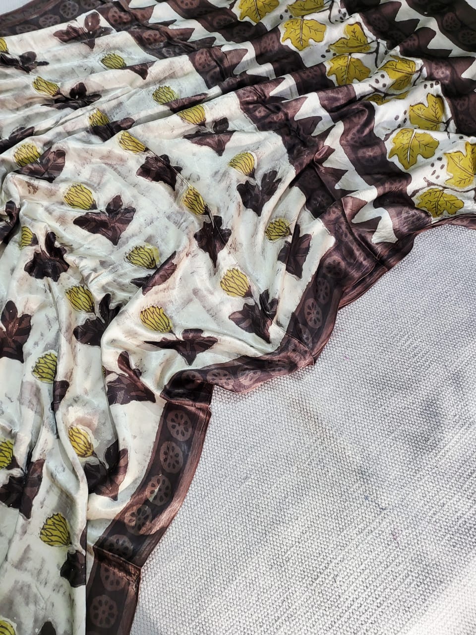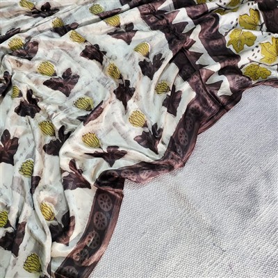 Step into elegance with the Earthy Brown Leaves Modal Silk Saree with Unique Seed Pod Motifs from Blockart. This saree features a light cream base adorned with dark brown and yellow-green leaf and seed pod patterns, exuding a natural charm. The smooth and shiny silk fabric drapes gracefully, offering a luxurious feel against your skin.