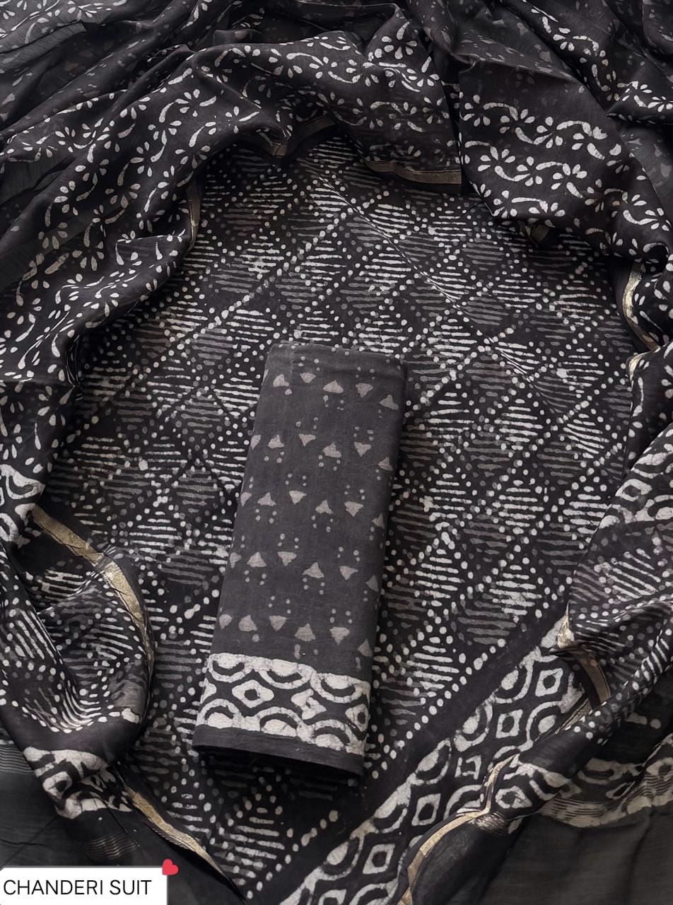 This hand block printed chanderi silk dress materials with chanderi silk duptta set includes: