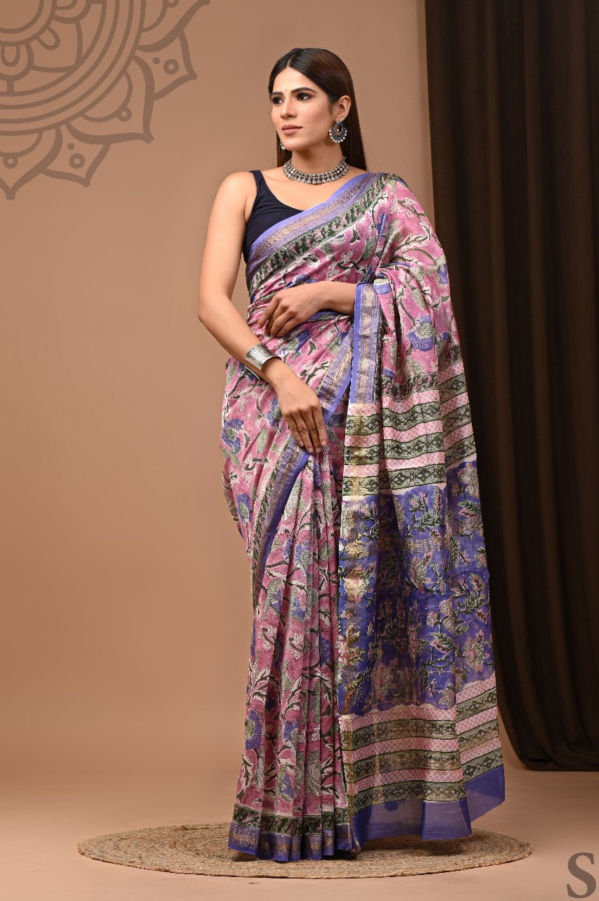 Drape yourself in elegance with this exquisite pink saree featuring intricate floral prints and a contrasting royal blue pallu. The saree’s delicate design blends traditional artistry with contemporary charm, making it perfect for weddings, festive occasions, and special celebrations. The soft, comfortable fabric ensures graceful pleats, while the detailed border and vibrant colors add a regal touch. Pair it with statement jewelry to complete your timeless ethnic look.