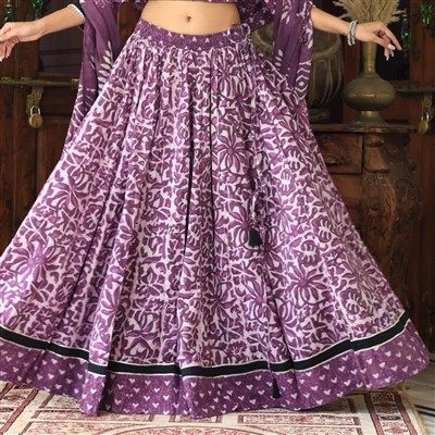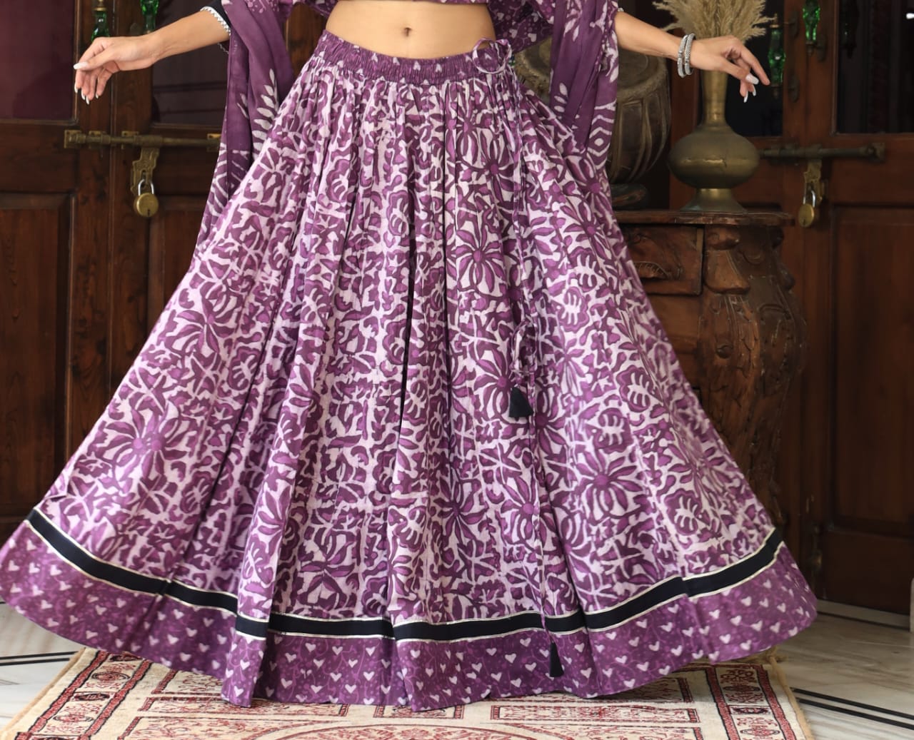 Elegant Purple Floral Block Print Cotton Lehenga Skirt