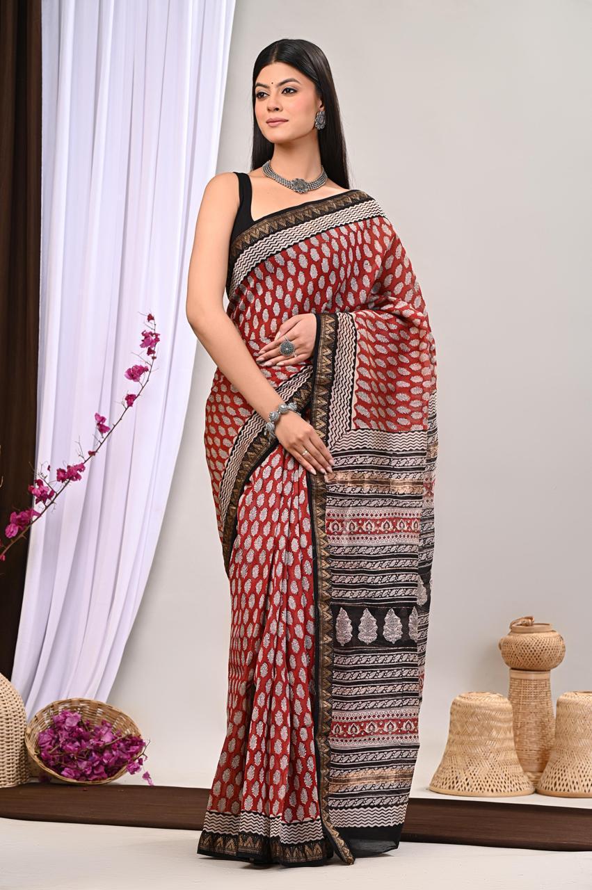 This sophisticated red saree features a delicate, all-over white paisley or teardrop block print, offering a subtle texture. The pallu provides a striking contrast with its bold black background adorned with traditional white motifs and horizontal stripes in varying patterns. A thin, decorative border in black and beige runs along the edges, adding a refined finish to this classic and stylish drape.