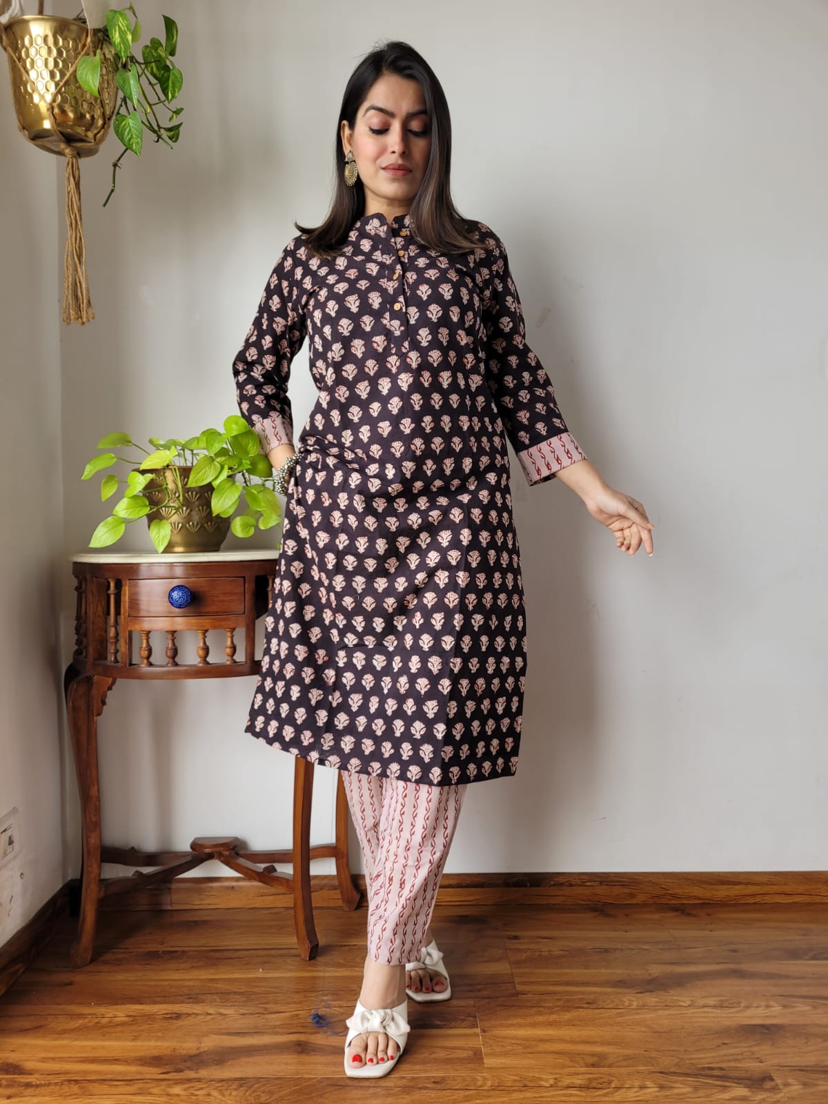 This kurti and pant set features a modern frock silhouette that effortlessly shapes your figure while offering room to move freely. With elegantly detailed necklines and a sleeveless option, it’s designed to suit your individual style while celebrating the timeless craft of hand block printing.