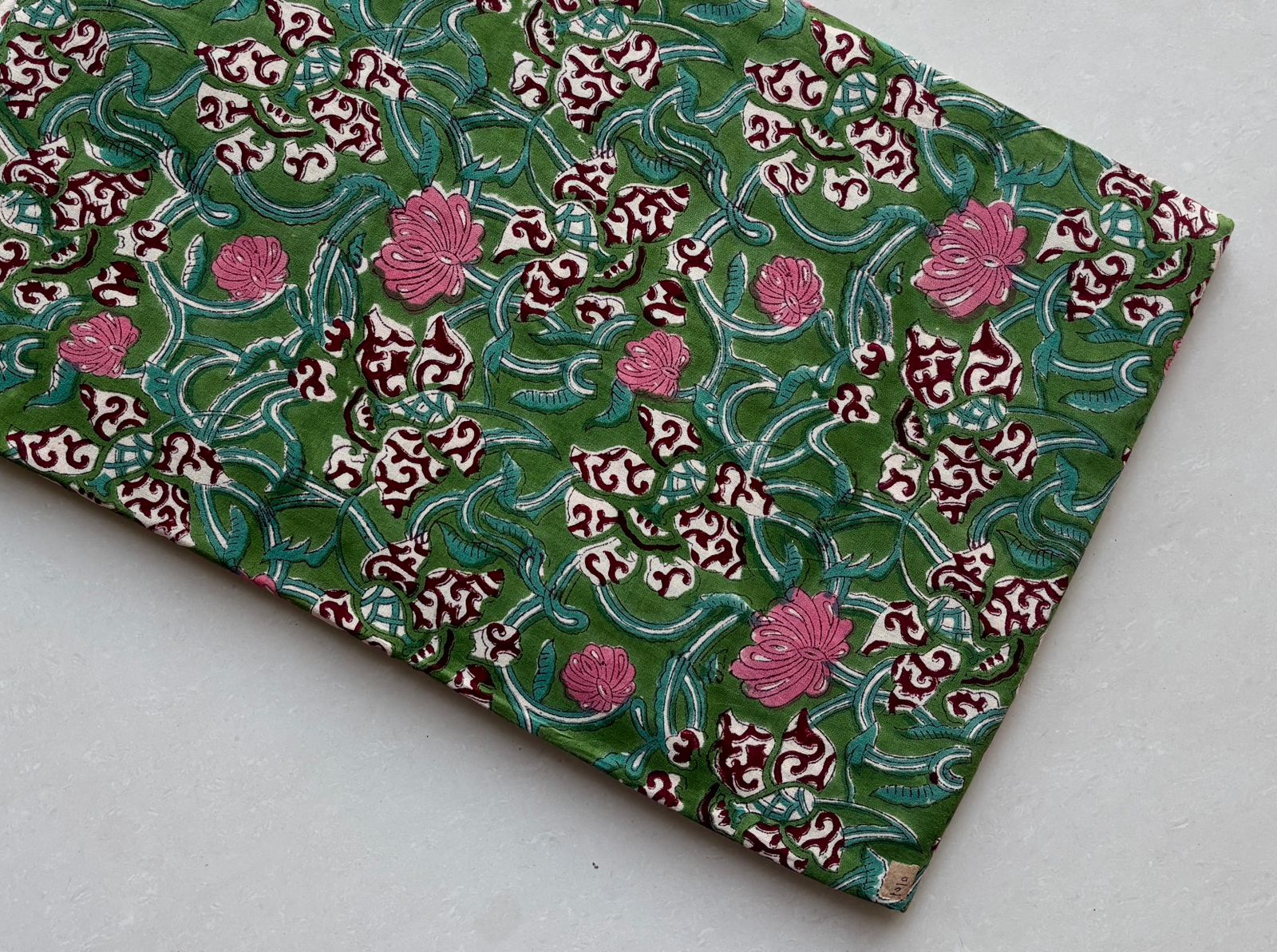 Are you on the lookout for a fabric that blends tradition with contemporary flair? Our Emerald Blooms Handcrafted Cotton Running Fabric is your answer. This exquisite textile features a lush emerald backdrop adorned with delicate pastel pink flowers, deep burgundy accents, and swirling teal leaves. Each floral design tells a story, meticulously crafted to bring a touch of nature's artistry into your creations.