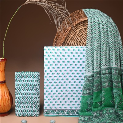 In a world where tradition meets contemporary style, the Emerald Blossom Hand Block Cotton Ensemble tells a story of artistry and heritage. The soft cotton fabric, adorned with intricate floral motifs in vibrant teal and emerald green, reflects the skill of artisans who breathe life into each piece. The lightweight chiffon dupatta adds a touch of ethereal elegance, making it an excellent choice for a variety of occasions.