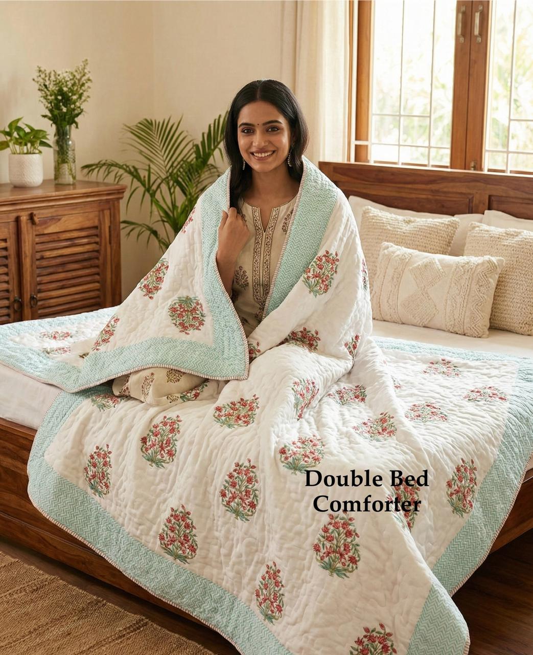 Wrap yourself in the soft embrace of our Emerald Blossom Quilted Cotton Comforter, a stunning fusion of traditional artistry and contemporary design. The delicate floral motifs, adorned in vibrant crimson and lush emerald, dance gracefully across a serene ivory canvas, invoking the charm of India's rich textile heritage.