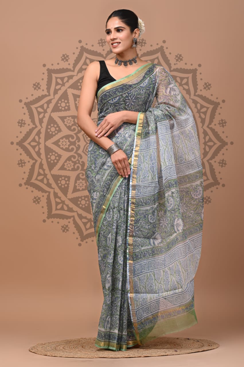 Step into a world of artistry with our Emerald Garden Multi-Print Kota Doria Saree, where each fold tells a story of traditional craftsmanship. Crafted from pure Kota Doria, this saree is adorned with intricate floral and geometric patterns that harmoniously blend the old with the new, creating a piece that’s both timeless and modern.