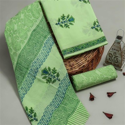 Indulge in the beauty of hand block printing with this exquisite cotton suit fabric set. Crafted with care, this set features intricate floral motifs and leafy patterns in shades of emerald green and blue. The top, bottom, and dupatta pieces offer a traditional yet elegant appeal, perfect for creating stunning ethnic wear. Made from premium cotton fabric, experience comfort and style like never before with this artisanal creation.