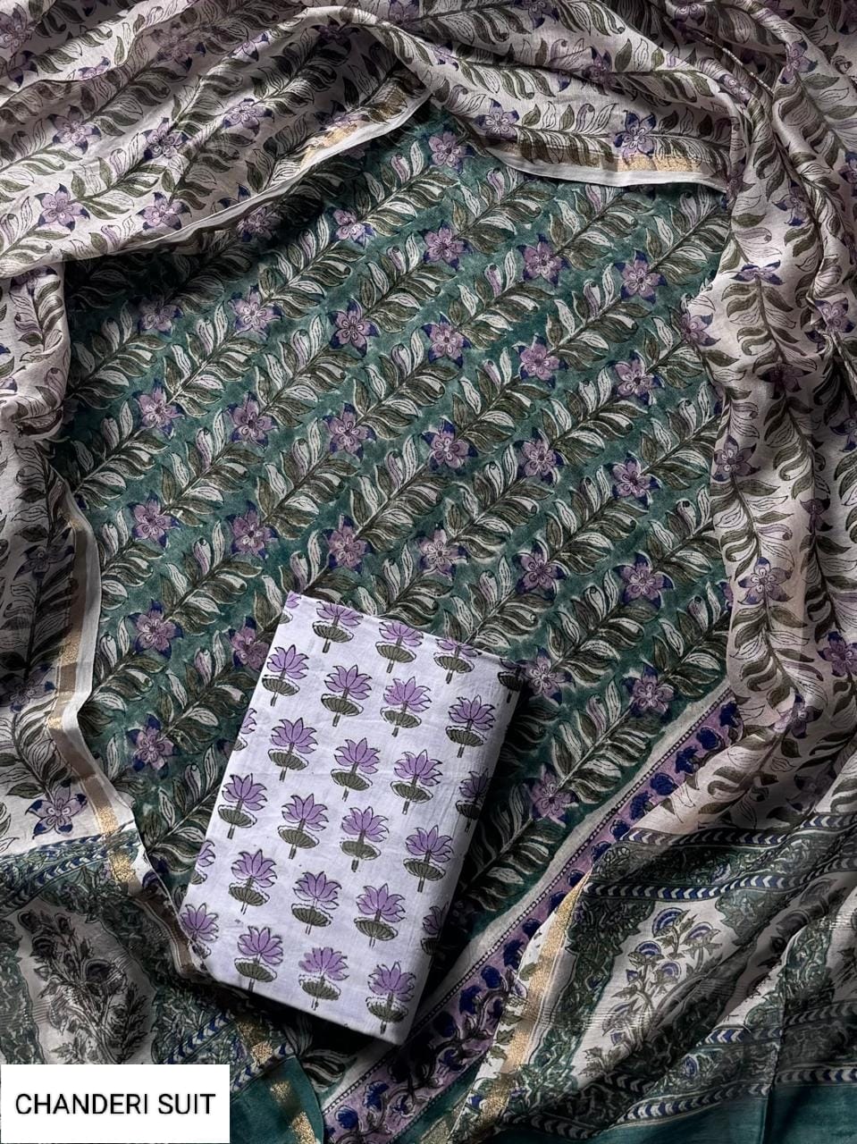 Step into a world of elegance with our Emerald Leaf Dance Chanderi Silk Ensemble. Adorned with intricate leaf patterns in shades of green, purple, and beige, this ensemble exudes a sense of traditional charm. The lightweight and sheer Chanderi silk fabric drapes gracefully, offering a luxurious feel against your skin.