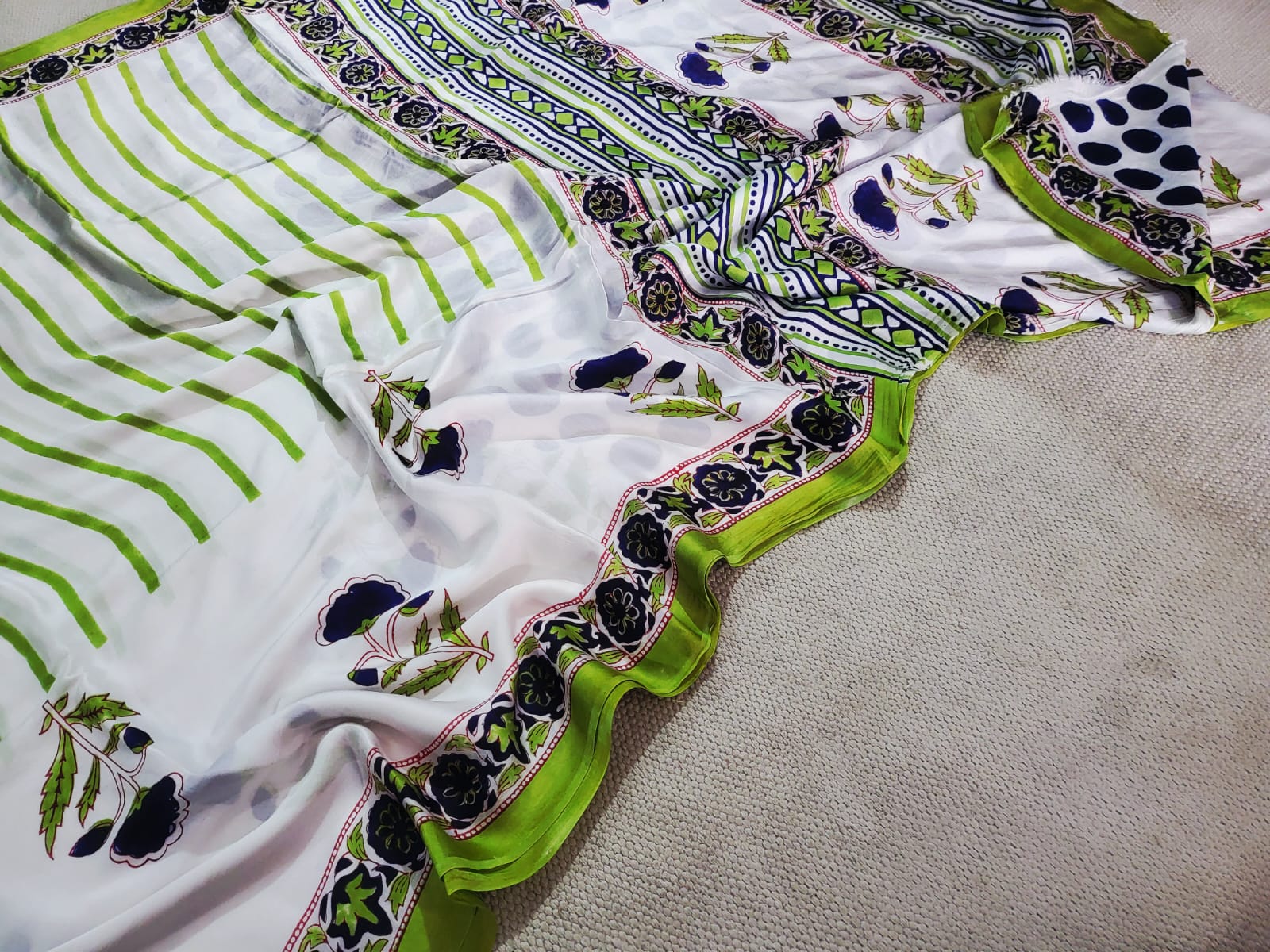Delve into the heritage of Indian textile traditions with the delicate combination of polka dots and floral patterns on the pallu, showcasing a blend of modern style with traditional craftsmanship. This saree is not just a garment but a tribute to the artistry and skill passed down through generations.