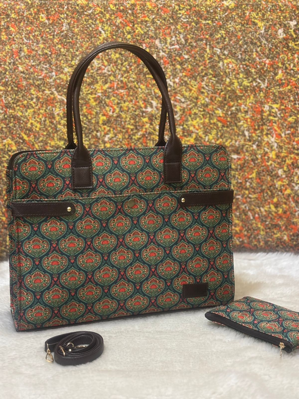 The emerald green base is adorned with intricate paisley motifs, complemented by hints of crimson and golden yellow—creating a captivating visual experience. The tote’s structure provides durability without sacrificing style, making it a reliable companion for everyday adventures.
