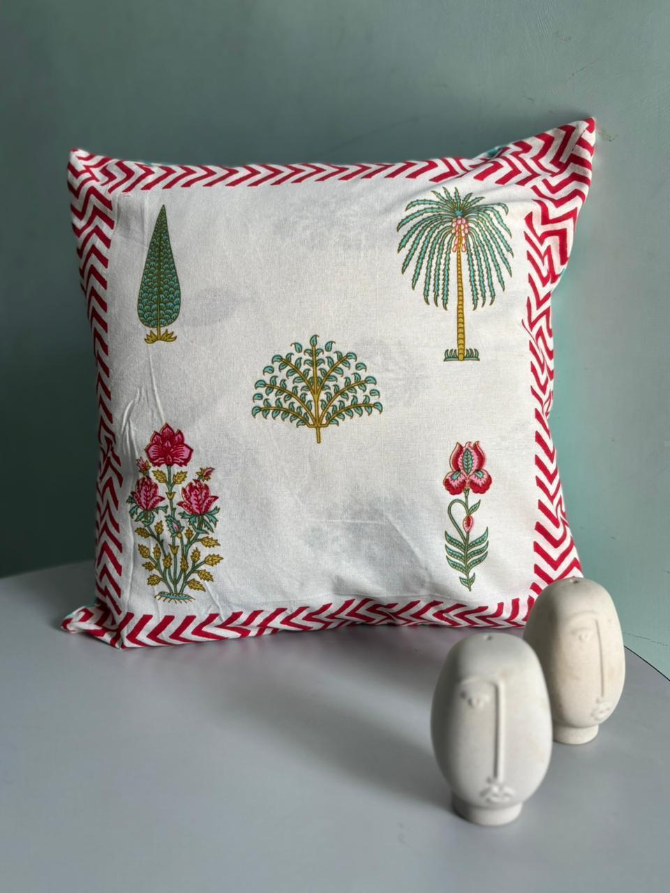 Awash in a serene white backdrop, the Emerald Tree Blossom cushion covers showcase a captivating interplay of motifs inspired by nature. Rich emerald greens entwine with luscious crimson blooms, while delicate mustard accents breathe life into each design, creating a visual symphony that transcends ordinary decor.