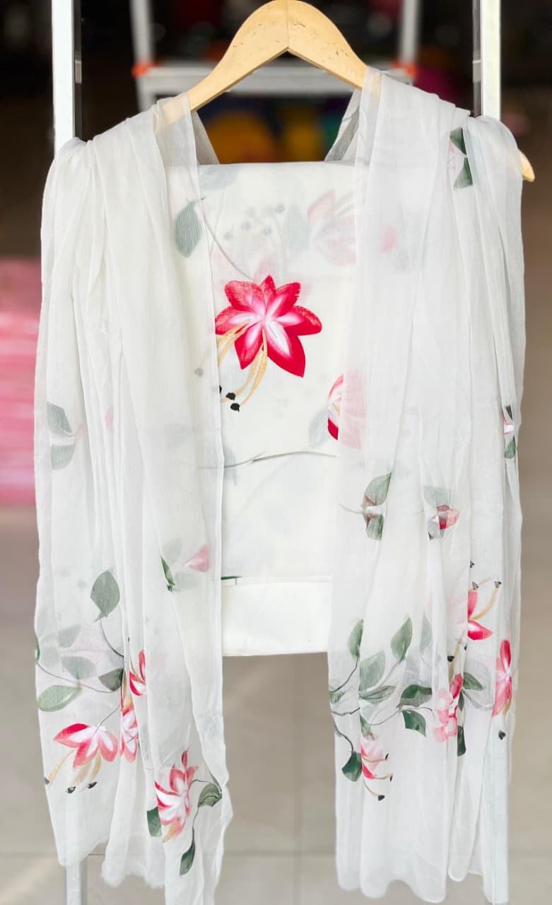 Feel the gentle caress of 100% pure cotton against your skin, providing breathability and comfort, while the chiffon dupatta adds a touch of sophistication. Whether you're dressing for a casual outing or a festive gathering, this versatile ensemble effortlessly adapts to your needs, ensuring you look and feel your best.