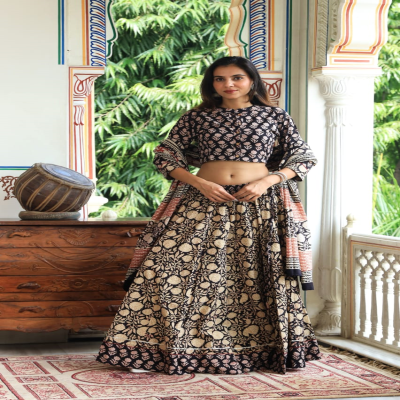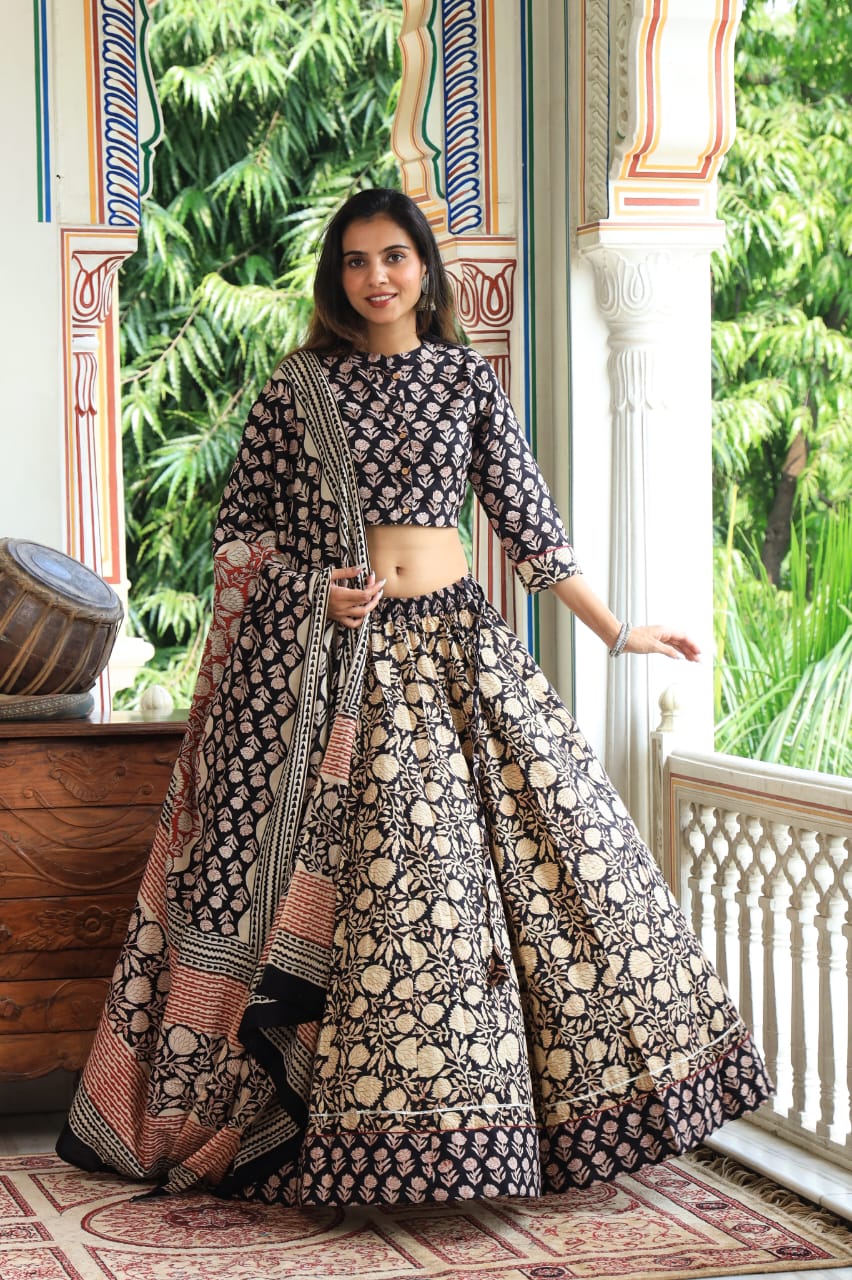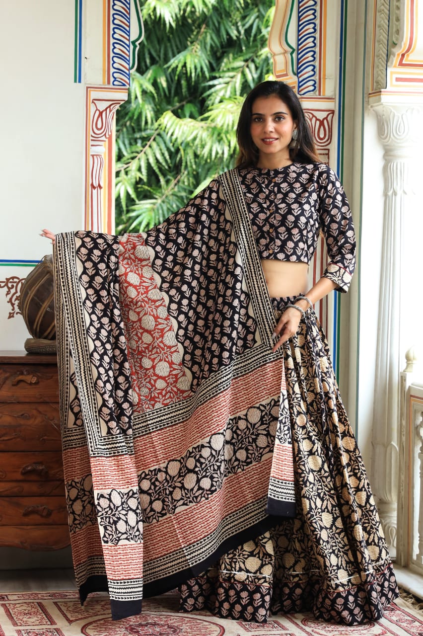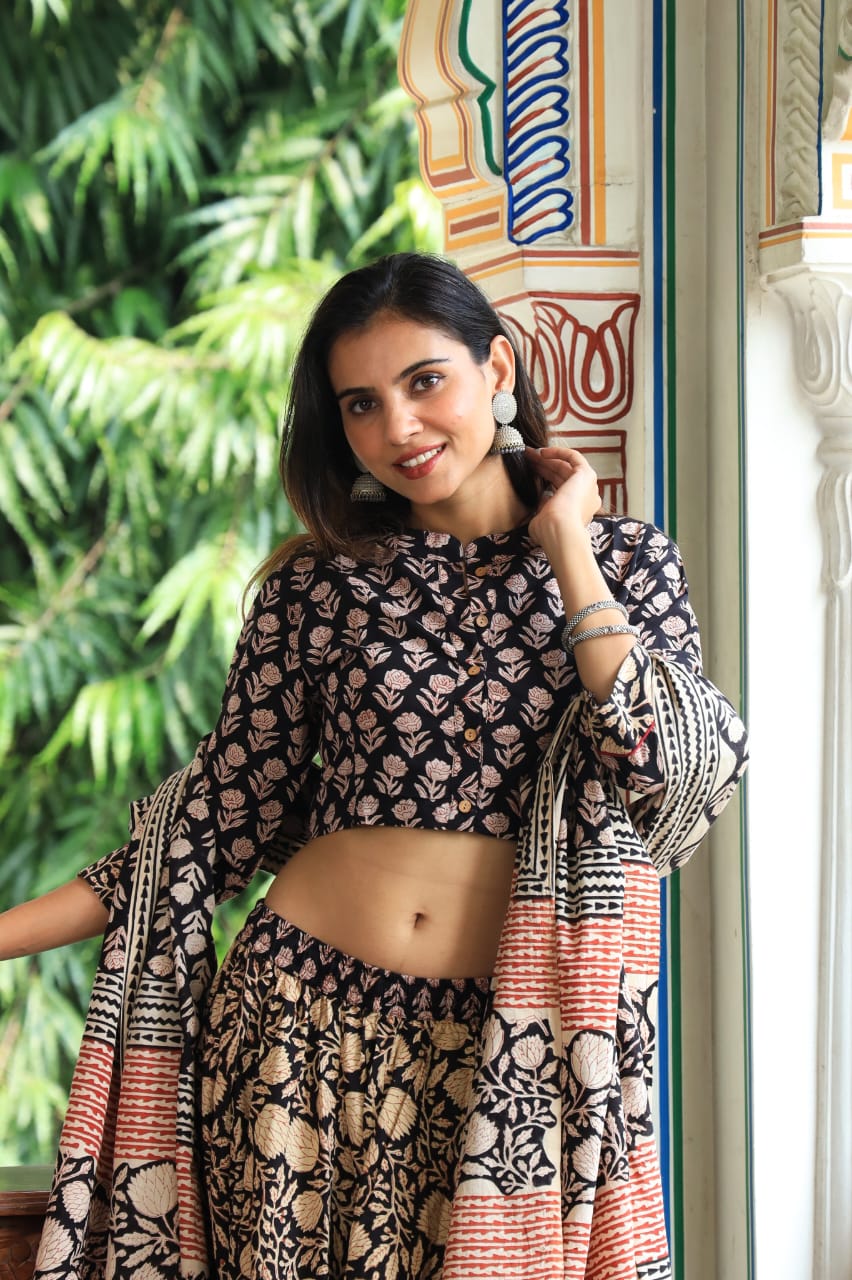 Package: Bagru Hand Block Printed Designer Crop Top & Skirt With Mulmul Dupatta.