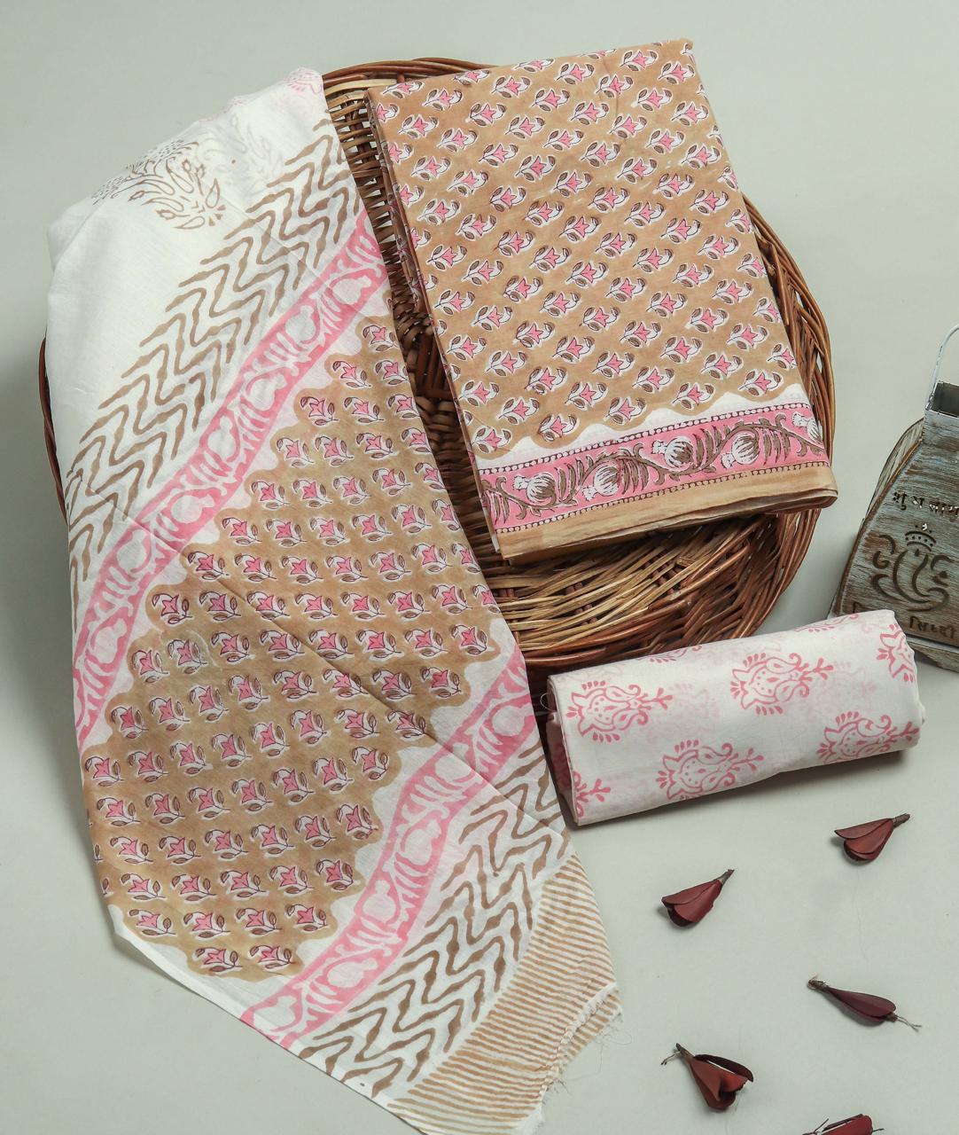 Indulge in the artisanal charm of this hand block printed cotton suit set with a delightful floral pattern and intricate zigzag dupatta. Crafted with care, the top, bottom, and dupatta fabrics offer comfort and elegance, perfect for creating traditional ethnic wear. The premium cotton material ensures a soft feel against your skin, making this set a must-have for those who appreciate quality craftsmanship.