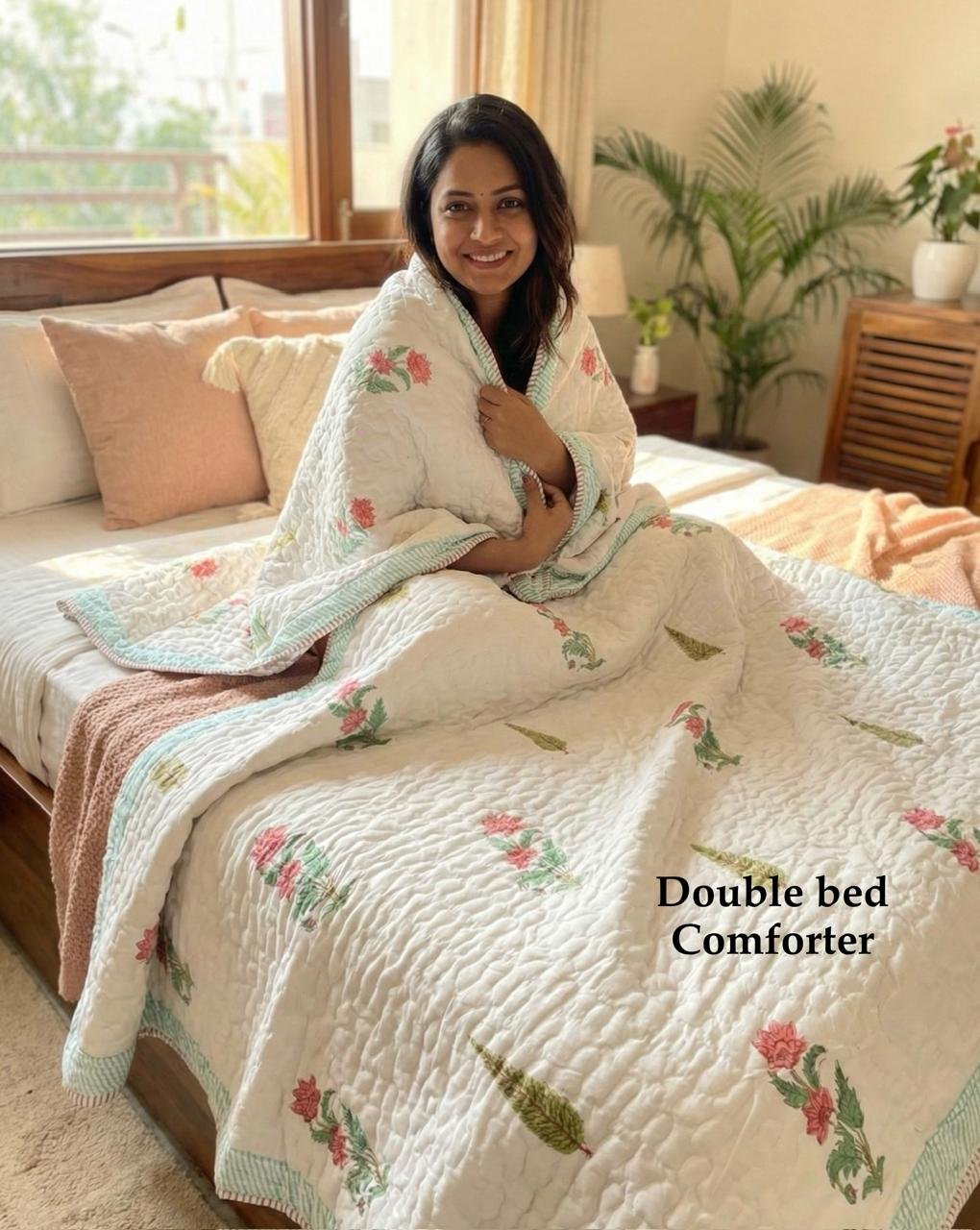The intricate block printing technique used in its creation not only honors the age-old craft but also ensures that each comforter is unique, with its own story to tell. The soft cotton fabric promises a gentle embrace, making it an inviting addition to your restful retreat.