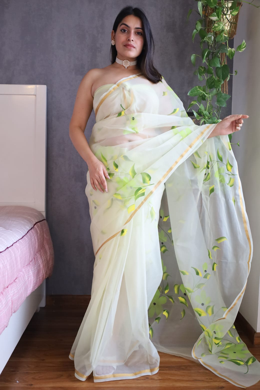 Immerse yourself in the world of floral fantasy with our hand painted organza saree, a whimsical creation that celebrates the floral beauty of nature. Each petal is lovingly hand-painted on the fabric, creating a spectacular tableau of vibrant colors and delicate textures. The sheer organza fabric drapes gracefully, while the complementary blouse adds a touch of sophistication to the ensemble. Be it worn for garden weddings or day functions, the Floral Fantasy Saree will surely evoke feelings of happiness and admiration, making it the perfect choice for unforgettable moments and cherished memories.