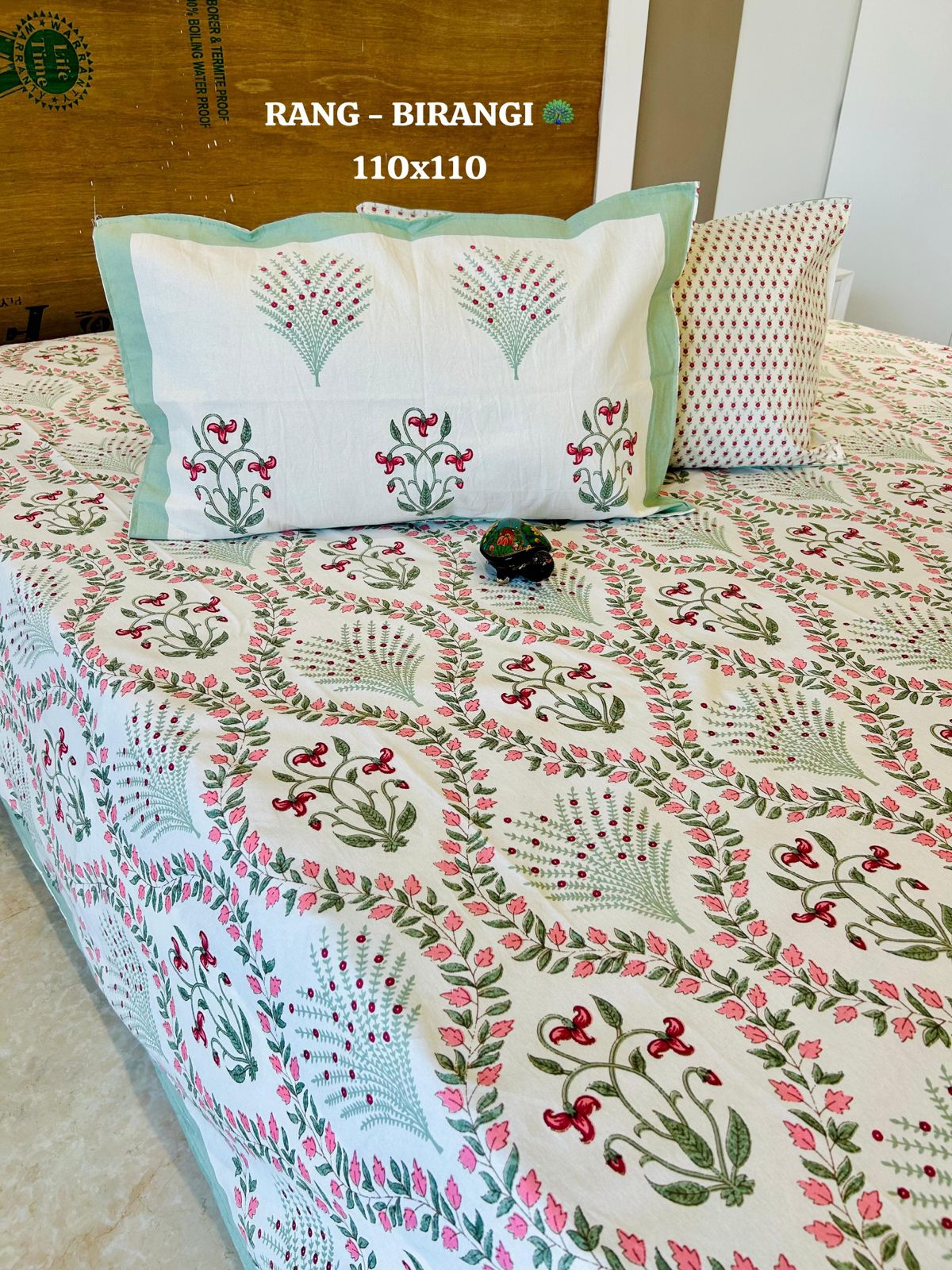 Experience the timeless beauty of hand block printing with our exquisite Floral Green and Pink Hand Block Cotton Bedding Set. Crafted with premium cotton, this set includes a jumbo king-size bedsheet and two pillow covers. The floral design in green leaves and pink/red flowers adds a touch of traditional Indian charm to your bedroom.