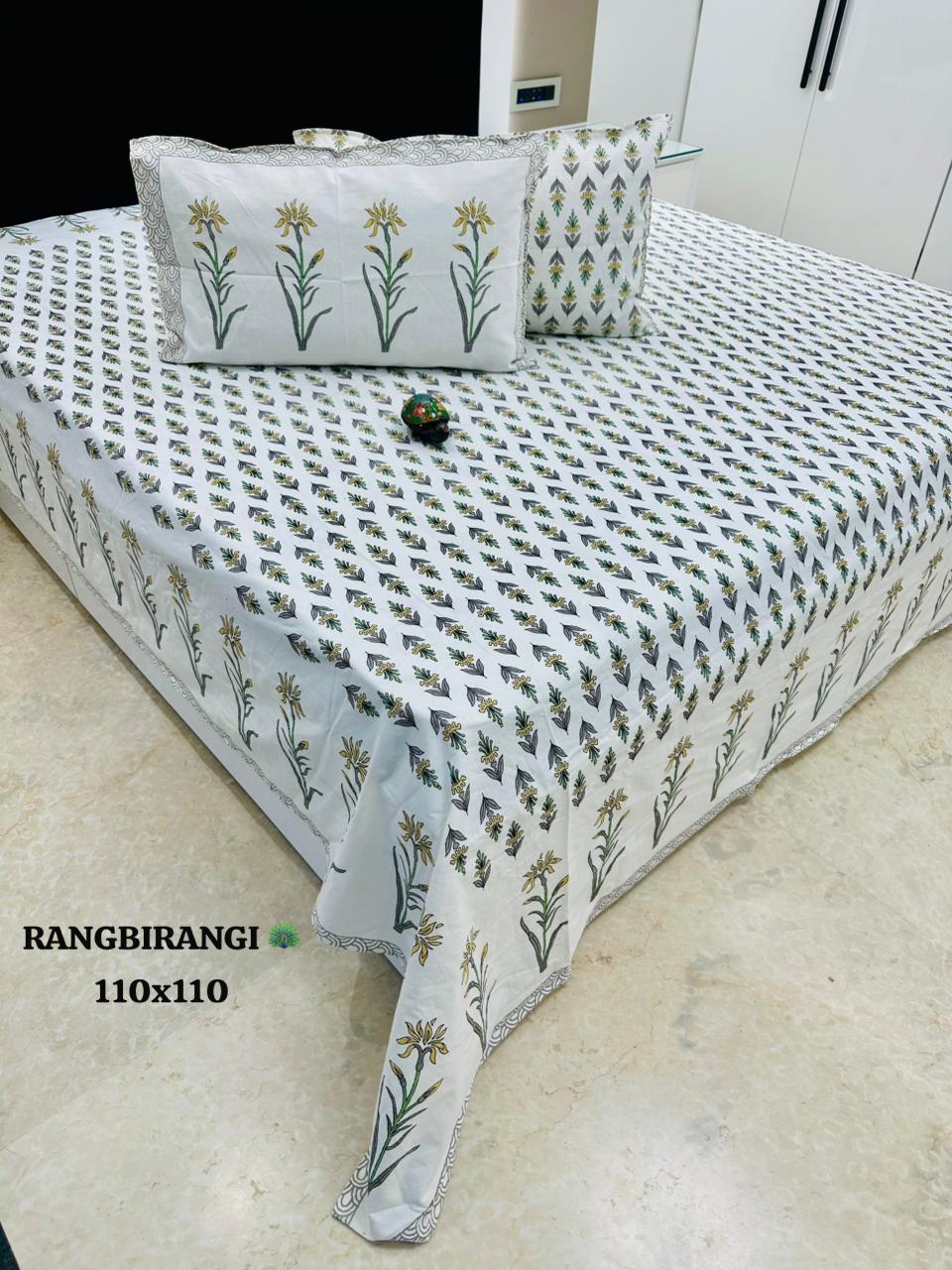Indulge in the artistry of hand block printing with this exquisite Floral Green Harmony Cotton Bedsheet with Pillow Covers. Crafted with premium cotton, this jumbo king-size set features a delightful floral pattern in shades of green, yellow, and black. The bedsheet showcases a repetitive floral design while the pillow covers complement with larger and smaller flower motifs. Elevate your bedroom with the artisanal charm of traditional Indian craftsmanship. Explore more cotton bedsheets.