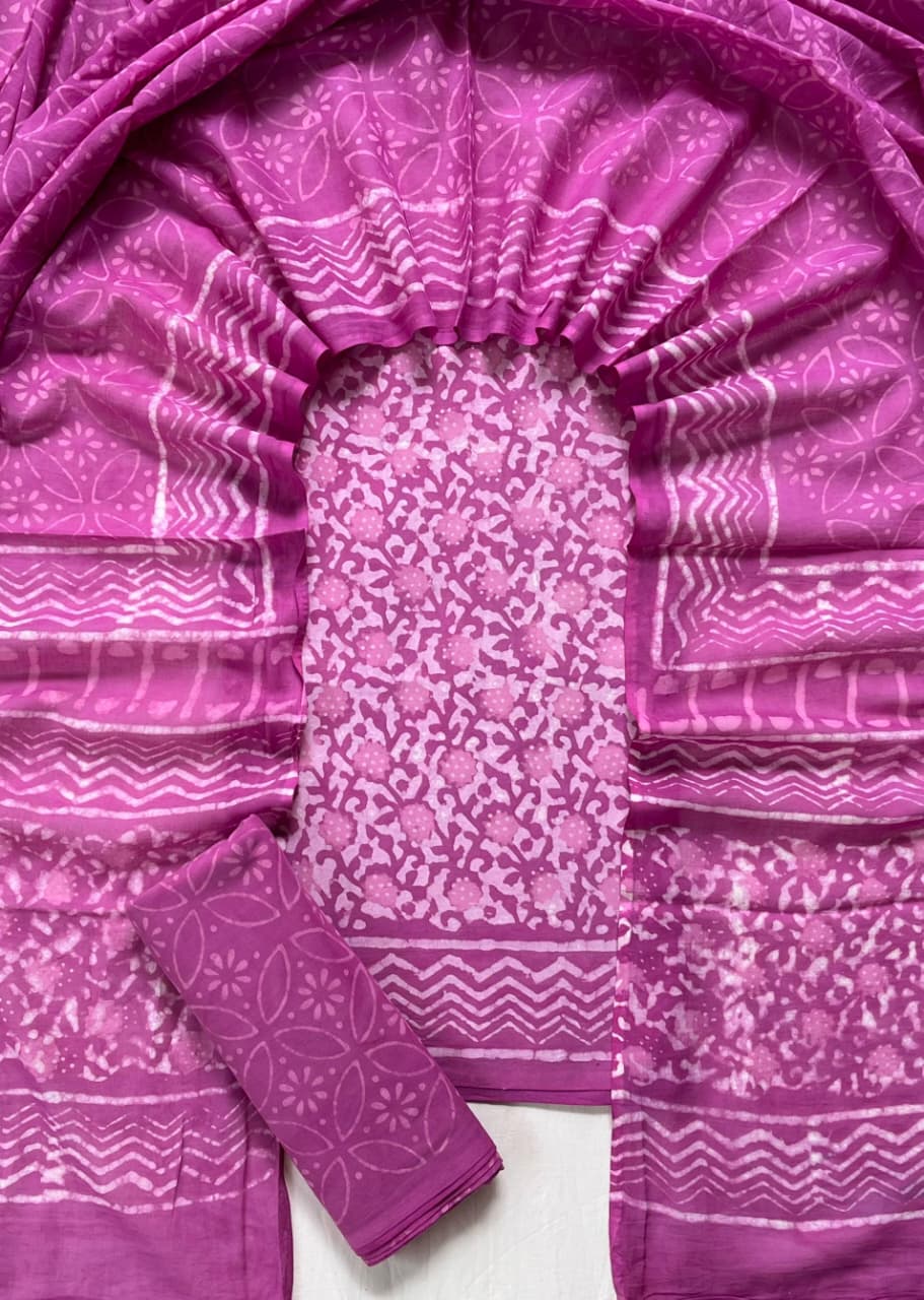 Elevate your ethnic wardrobe with this exquisite ensemble featuring hand block printing on premium cotton fabric. Crafted with care, this set includes a top, bottom, and dupatta in a vibrant floral pink design. Embrace comfort and tradition with this artisanal creation.