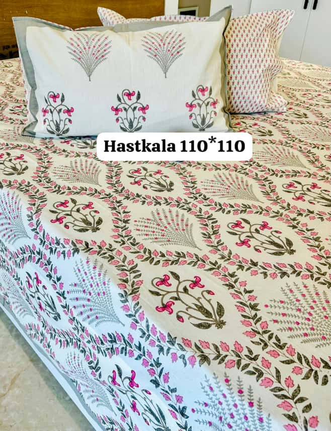 Indulge in the timeless art of hand block printing with our Floral Symphony Cotton Bedding Set. Crafted from premium cotton fabric, this set features a symphony of pink flowers and green leaves in a detailed floral pattern. The 110x110 inches bedspread and two 18x27 inches pillow covers showcase exquisite craftsmanship and traditional Indian design. Elevate your bedroom decor with this artisanal piece that offers both style and comfort.