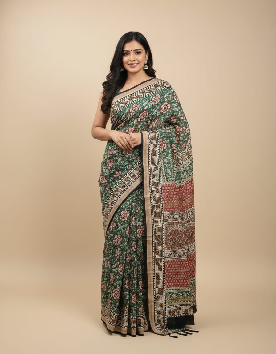 Step into a world where tradition blooms in elegant hues with the Forest Green Floral Hand Block Print Saree. This exquisite piece showcases the time-honored art of Bagru printing, reflecting the skilled hands of artisans who have perfected their craft over generations. The lush forest green fabric is adorned with vibrant crimson florals, creating a striking contrast that captivates the eye.
