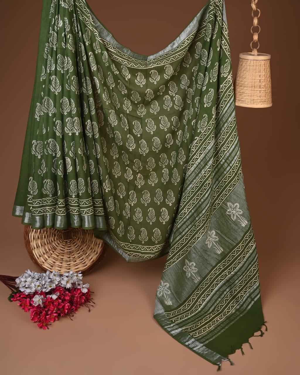 Crafted from pure linen using authentic hand block printing techniques, this saree embodies eco-friendly practices, ensuring that your purchase supports sustainable fashion. Each piece is unique, reflecting the artisan's hand and the care that goes into its creation.