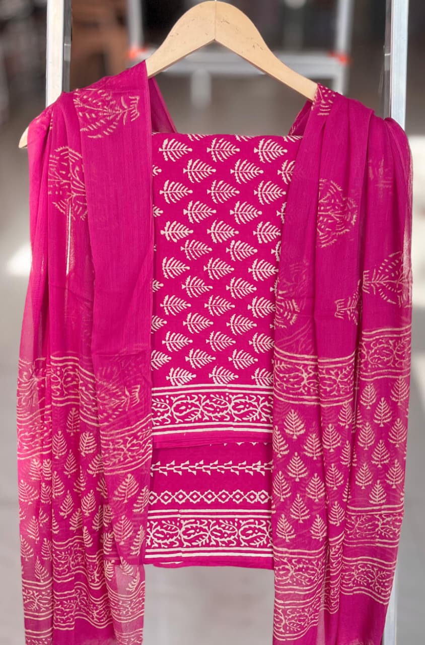 Delve into the heart of Indian artistry with the Fuchsia Bloom Block Print Cotton Suit Set. This exquisite piece is crafted from 100% pure cotton, showcasing a fusion of bold fuchsia hues with delicate cream motifs that dance across the fabric, embodying the spirit of traditional hand block printing.