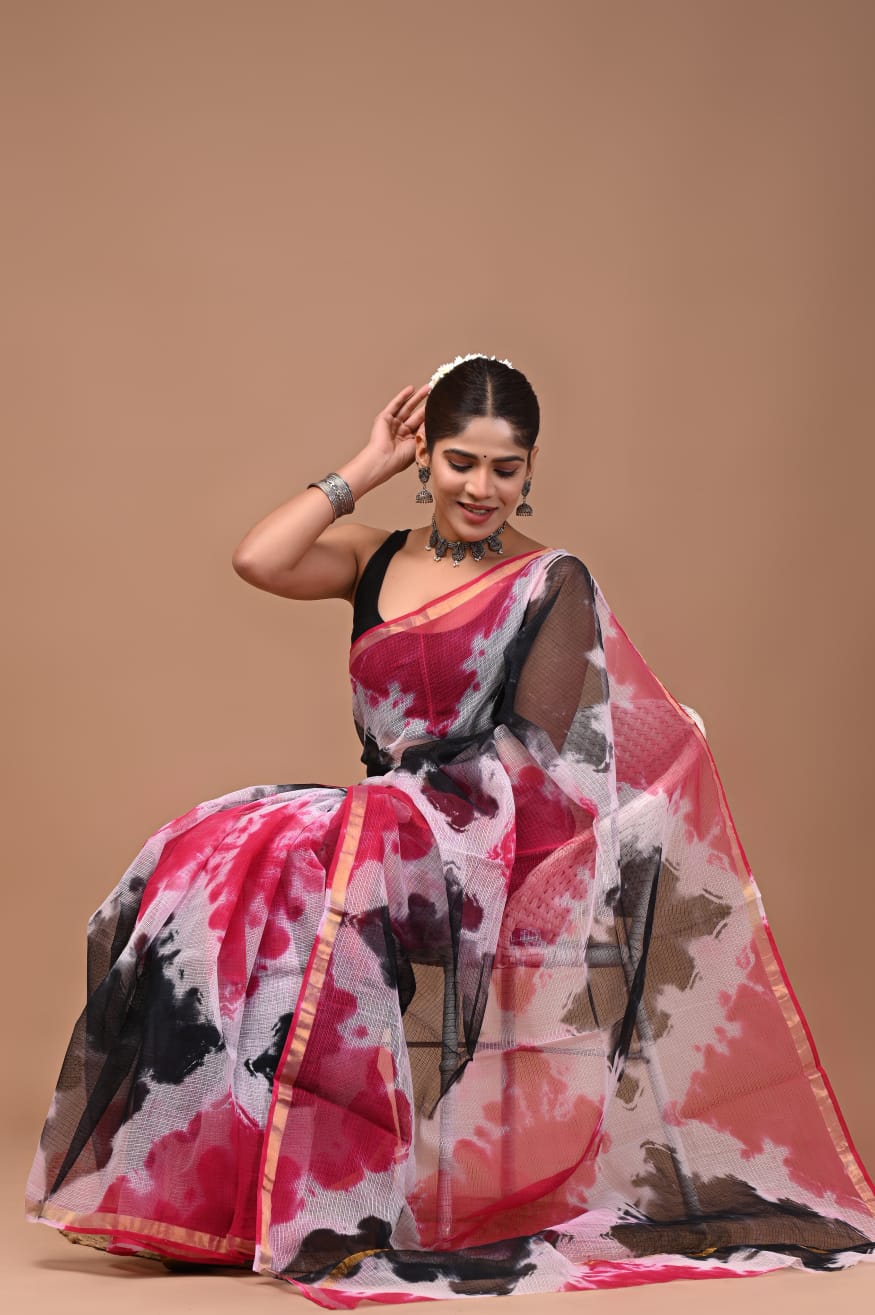 Crafted in the heart of Indian tradition, the Fuchsia Dream Abstract Cotton Kota Doria Saree embodies a vibrant blend of hues, featuring a captivating interplay of fuchsia, crimson, and deep black. This artisan-crafted piece is adorned with abstract watercolor motifs, offering a delightful touch of modernity to a classic silhouette.