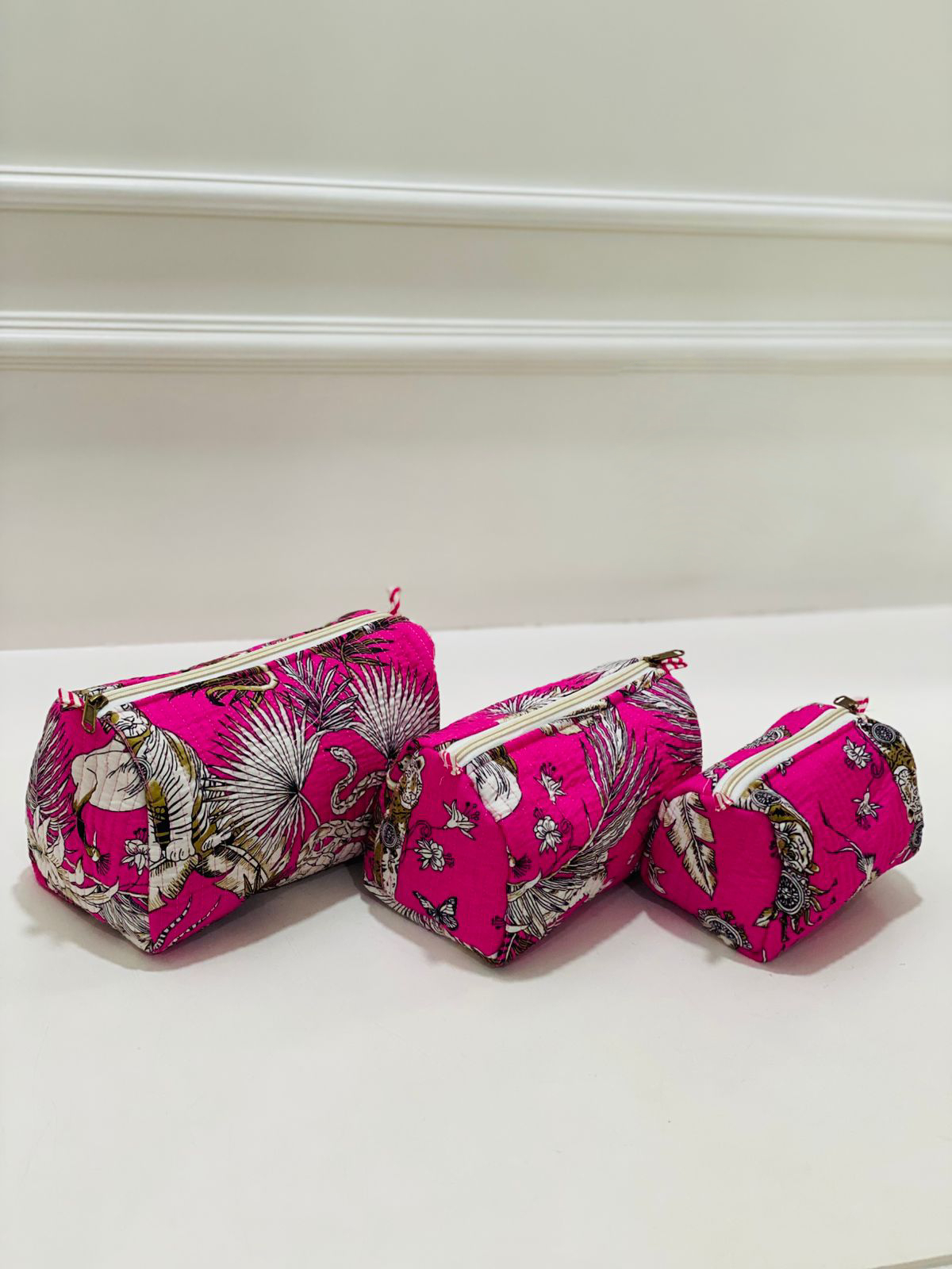 Are you looking for a way to keep your travel essentials organized while adding a splash of personality? This vibrant toiletries pouch set showcases a delightful fuchsia background adorned with charming flamingo motifs, seamlessly blending function and flair. Each pouch, made from a durable heavy quilted fabric, promises to be a reliable companion on every adventure.