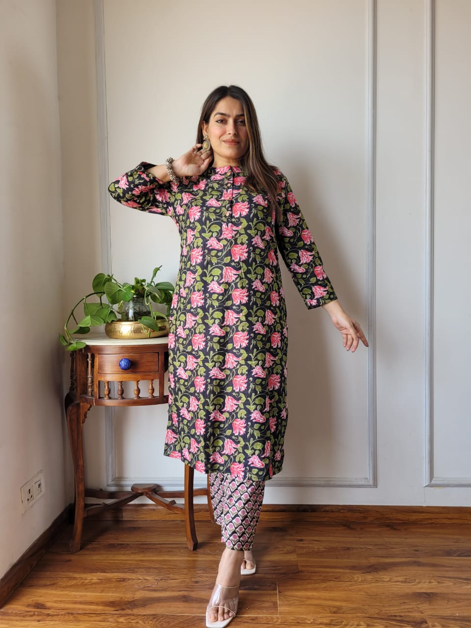 Crafted from soft cotton, this ensemble is designed to move with you, providing both comfort and a flattering silhouette. The kurti features a sophisticated stand collar and a subtle button placket, enhancing its modern aesthetic while celebrating traditional artistry.