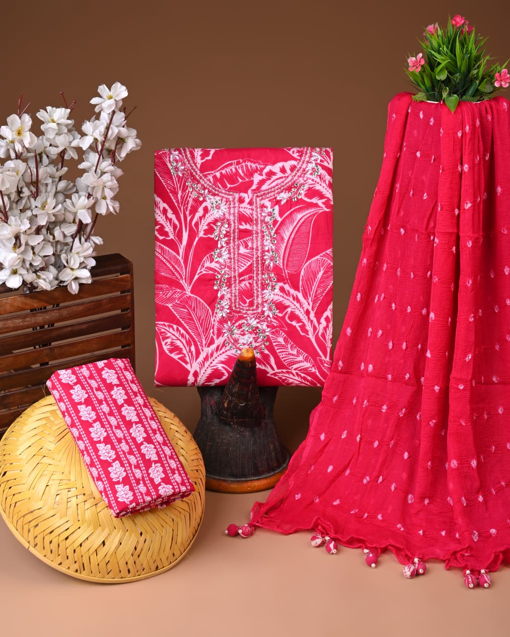 Rooted in the vibrant traditions of Indian craftsmanship, this fuchsia cotton suit set features an enchanting floral motif that dances gracefully across the fabric, embodying the essence of artisanal artistry. The exquisite gota patti detailing along the neckline adds a touch of opulence, making it a standout piece for both festive and casual occasions.