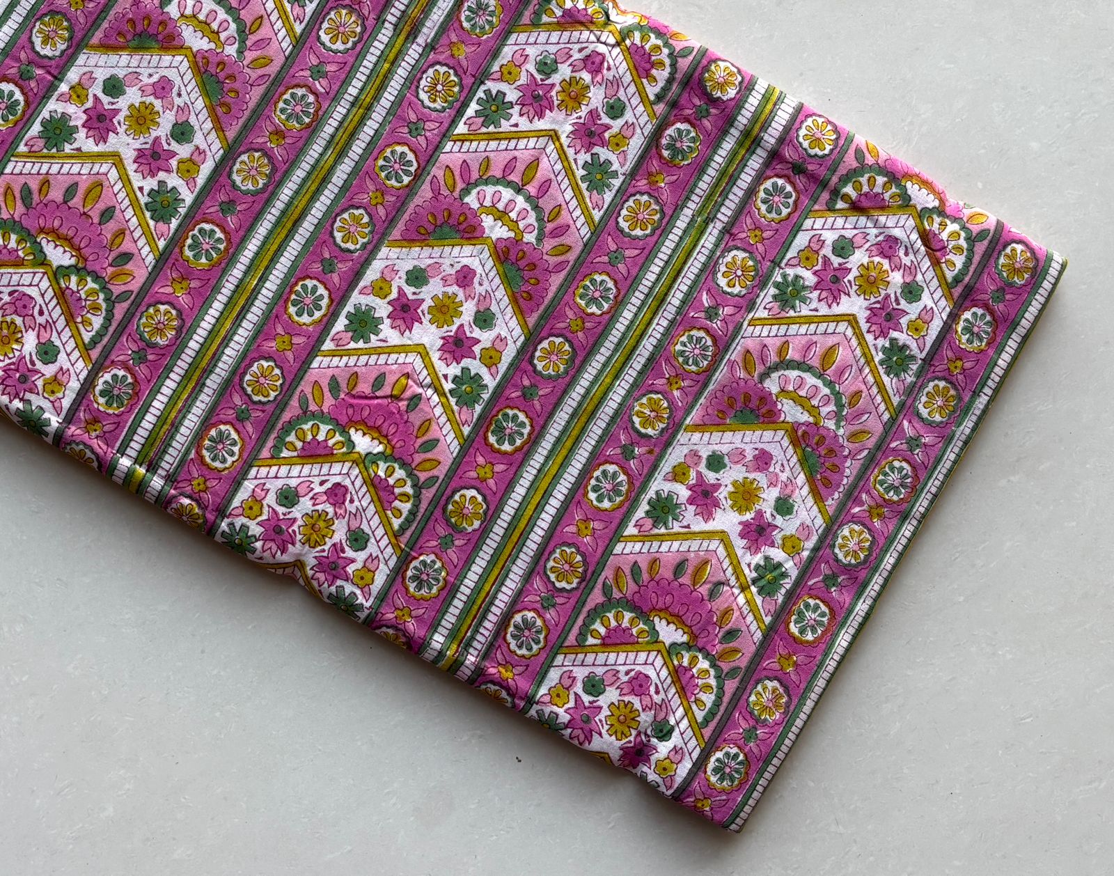 Immerse yourself in a lively spectrum of fuchsia, mustard yellow, deep green, and soft white with our Fuchsia Floral Mosaic Cotton Running Fabric. This exquisite textile captures the essence of Indian artistry, featuring a harmonious blend of intricate floral designs and geometric patterns that dance across its surface.