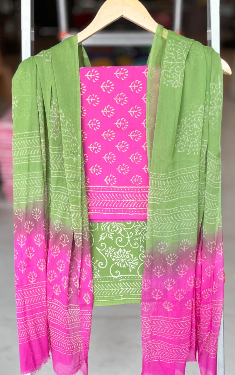 Step into a vibrant celebration of culture with our Fuchsia Garden Floral Cotton Suit Set. This exquisite unstitched ensemble features hand block printed designs that reflect the rich heritage of Indian textile artistry. Crafted from 100% pure cotton, the fabric ensures comfort and breathability, making it a delightful choice for both daily wear and festive occasions.
