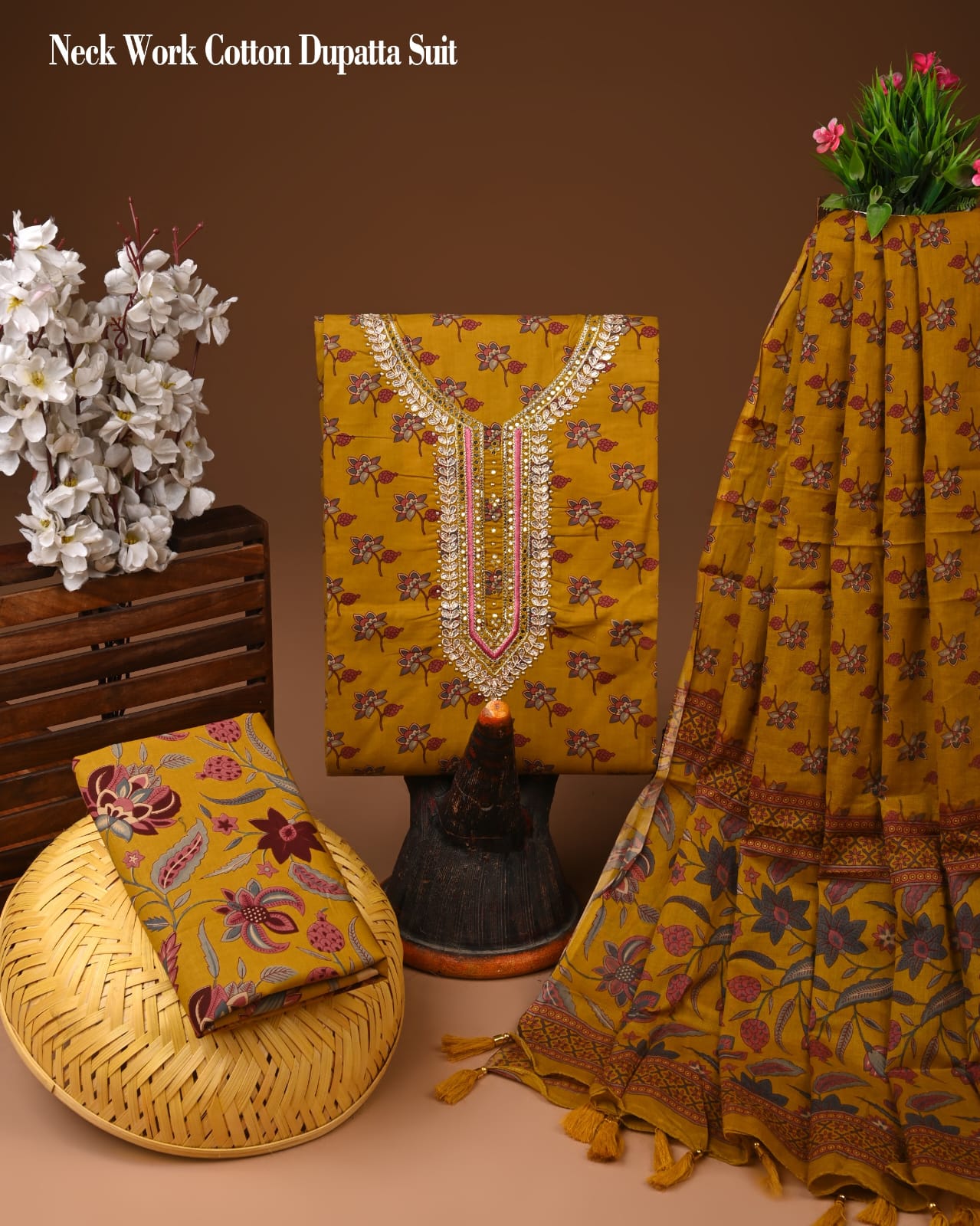 Embodying the spirit of Rajasthan, the Golden Blossom Gota Patti Cotton Suit Set showcases intricate floral motifs that bloom across a warm mustard canvas. Each detail reflects the artistry of hand block printing, celebrating a tradition that dates back centuries.