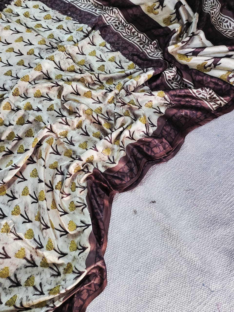 Embrace the unique charm of the Golden Blossoms Silk Elegance Saree in Earthy Hues. The intricate yellow floral motifs intertwining with brown stems on a light beige background create a mesmerizing design. The contrasting deep brown border adds a touch of sophistication to this artisan-crafted saree. Made from smooth and shiny modal silk fabric, this saree exudes elegance and traditional craftsmanship.