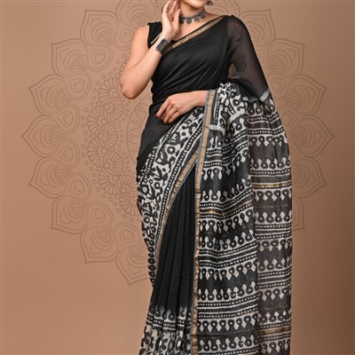 Elevate your ethnic wardrobe with our exquisite hand block printed Chanderi Silk Saree. Crafted with precision, this traditional saree features intricate white and grey patterns along with a thin golden border, adding a touch of elegance. Made from premium chanderi silk, this saree offers lightweight comfort and a graceful drape. Embrace the rich heritage of Indian craftsmanship with this artisanal piece, perfect for cultural celebrations and festive occasions.